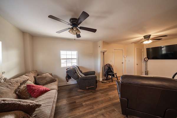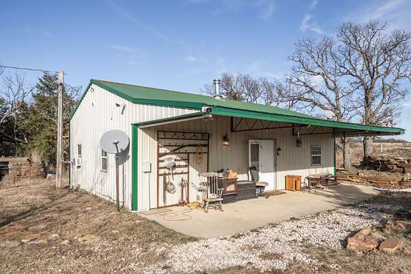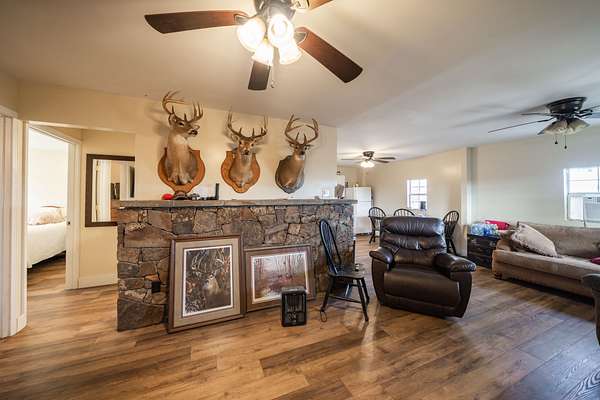 Improvements on the property are extensive and purpose-built. A rustic cabin with a stone fireplace serves as a comfortable retreat, completed by additional finished living quarters that provide flexibility for friends and family on those long hunting weekends. A large 150 x 60 steel barn and shop with electric and a spacious breezeway offers excellent space for equipment, storage, or livestock needs. The property is largely self-sustaining, featuring solar power and reliable water infrastructure, with rural water available for a future connection at the road. A high-fenced orchard benefits from a unique watering system tied into the main lake, further enhancing the land's productivity.