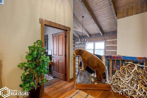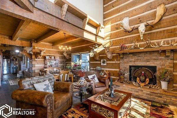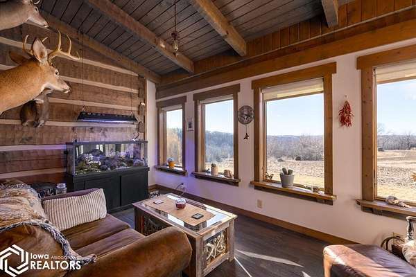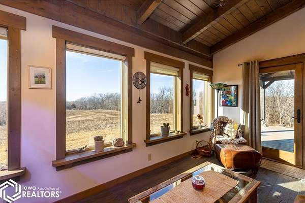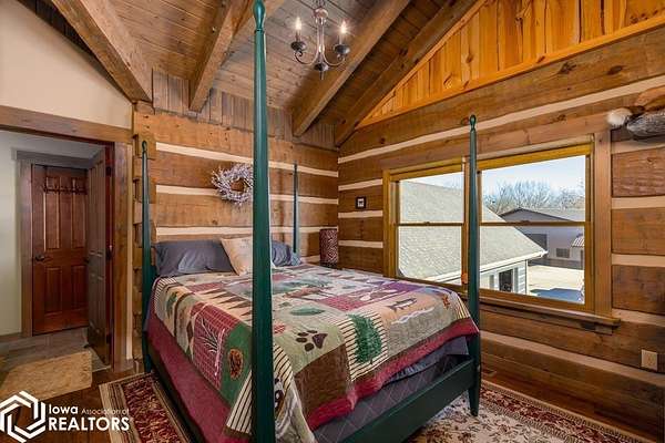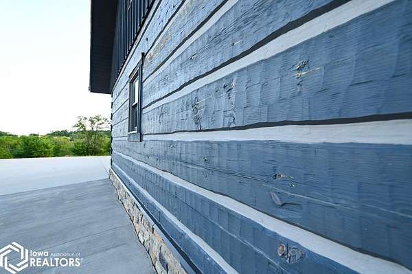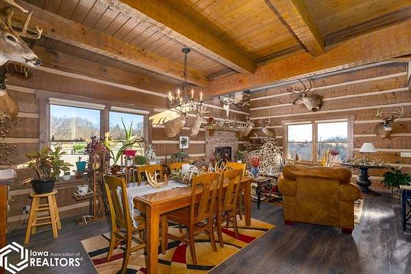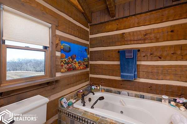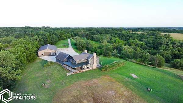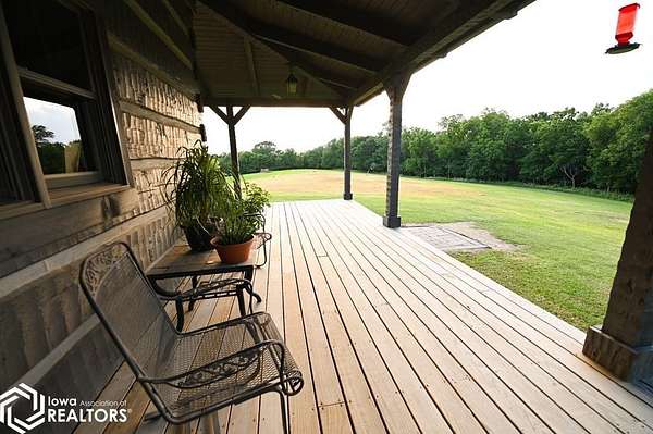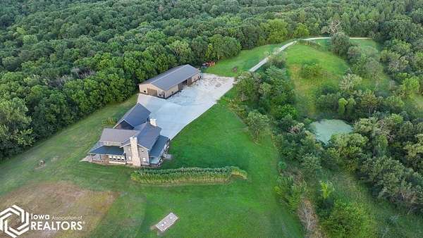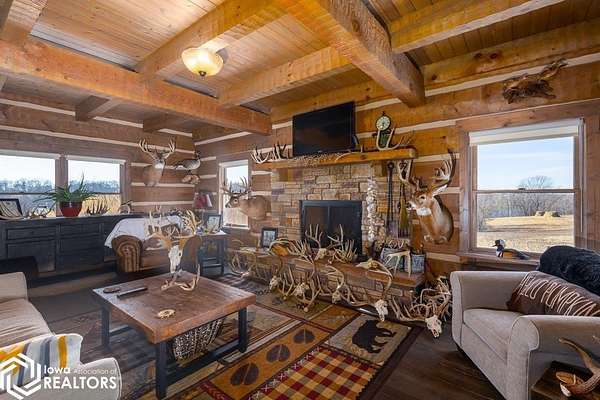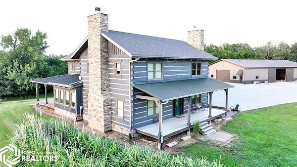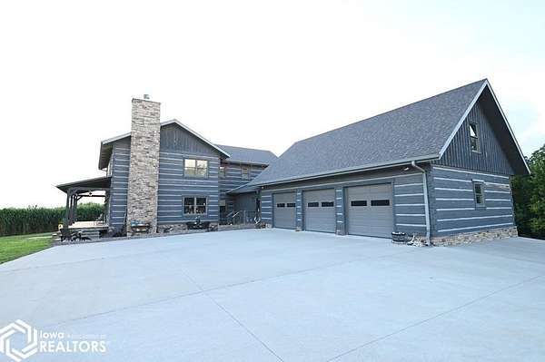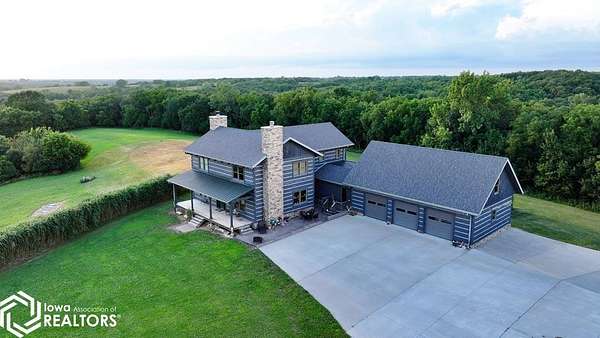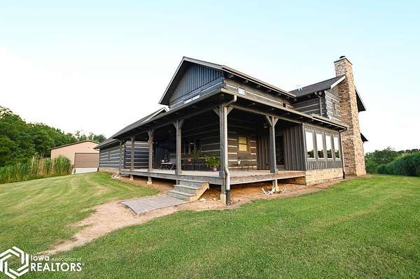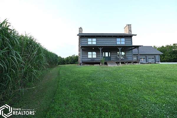 Escape the hustle and embrace the tranquility of country living with this breathtaking, approx. 18 +/- acre (additional land available) retreat just minutes from highway 14 and Chariton, Iowa, amenities. Tucked away in a private, scenic setting, this colonial square log home crafted by Heartstone Inc. Builder, offers the perfect blend of rustic charm and modern comfort. The structure improvements on the property are spectacular. A colonial wood/timber custom home spanning 3,070 finished SQFT showcases a 3-bedroom and 3 1/2 bath layout. A custom kitchen with soapstone counter tops with great views of the yard and wildlife. Beautiful interior open wood concept with vaulted ceilings throughout the home. The main floor offers a kitchen, sunroom, two living room areas with fireplaces, and a dining room. The second floor offers 3 bedrooms, with each room having its own full bathroom. Two porches that offer very peaceful and scenic views, it's common to have deer and turkey in the backyard on a daily basis. Enjoy energy-efficient living with a geothermal heating and cooling system. The home offers an attached three-car garage with loft storage. The basement was designed with 9-foot ceilings, presenting the new owner the opportunity to finish based on their vision.