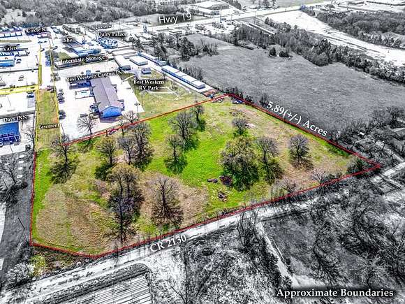 5.89 acres, more or less, located in the middle of a very high traffic intersection in Canton halfway between Terrell and Tyler. This unique acreage is ready for development and is zoned B2 for General Business'. It has VZCR 2130 to the west and comes with 2 easments on concrete driveways to State Hwy 19 and one directly to I-20 frontage road. The large lot is located directly adjacent to the Best Western Hotel with 2 wells on site, committment from the City of Canton for sewer and 5 water taps to the property. Bring your business to Canton or move your business to a better spot with this high visability location. Easy to see and easy to get in to and out of.