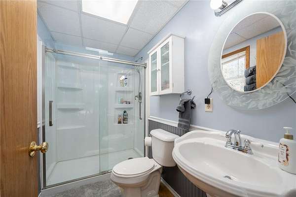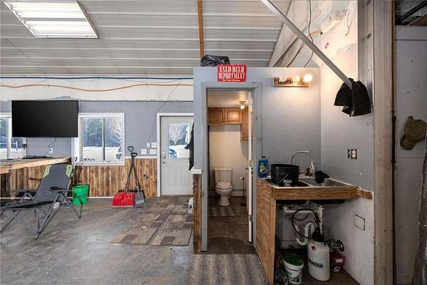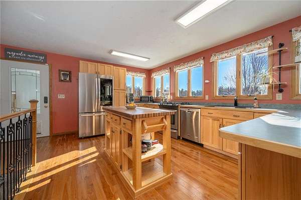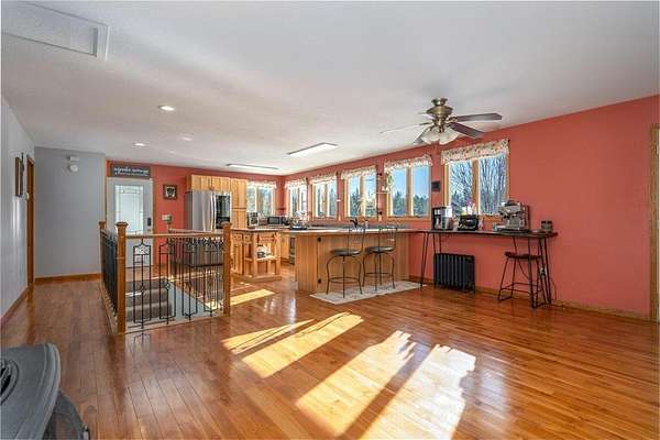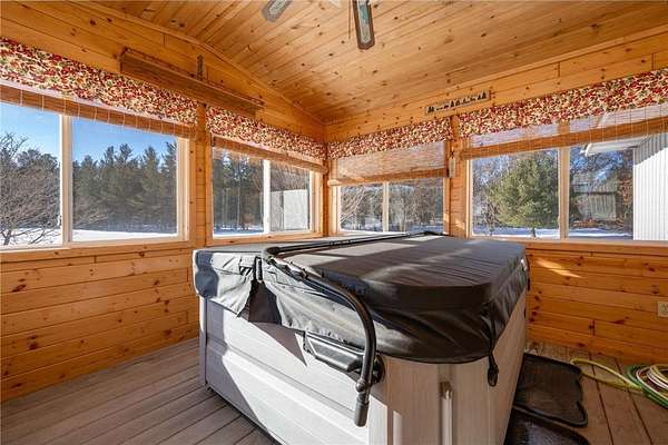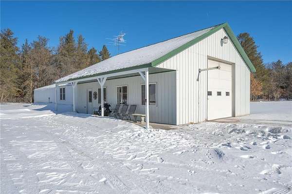 Beautiful and peaceful country retreat, a short drive to the Twin Cities and very near the lovely St Croix River and Governor Knowles State Park! This 4 bd/3ba ranch is beautifully done inside with newer flooring and fresh paint. The open floor plan makes the most of expansive views of the gorgeous 9 acre parcel. Outside there are mature fruit trees including apple, crabapple and plum, along with wild blueberries and raspberries. The fenced raised-bed garden area also has a healthy clump of asparagus, and has water available piped over from the sand point well inside the outbuilding. Next to the garden area is a chicken coop, currently used for garden tools but easily re-converted into an active coop if that's your heart's desire. About half the acreage is wooded with mature pines and hardwoods, and the view is just spectacular. Then there's the HUGE outbuilding! At 30 x 83 ft long, it's quite a work space, ready to go with water (includes a 1/4 bath), electricity, and it's own gas heater. Behind the outbuilding is the footing for what had been a quonset hut...the seller thought it a spectacular place to install a ground-mounted solar system. The single car garage is attached to the house via a breezeway, through which you can also access a fenced back yard area. The lower level of this ranch style home has a large family room space, 2 bd/1 ba and a very large equipment room that includes a cold pantry area. And then, let's not miss the enclosed 4-season front porch. Currently there's a hot tub in there, which may included with the right offer. So much here to see and enjoy - space, quiet, solitude, and the potential to create your own hobby farm! Adjacent 5-acre parcel also for sale under separate listing. Hurry for your chance to create your own northern escape!