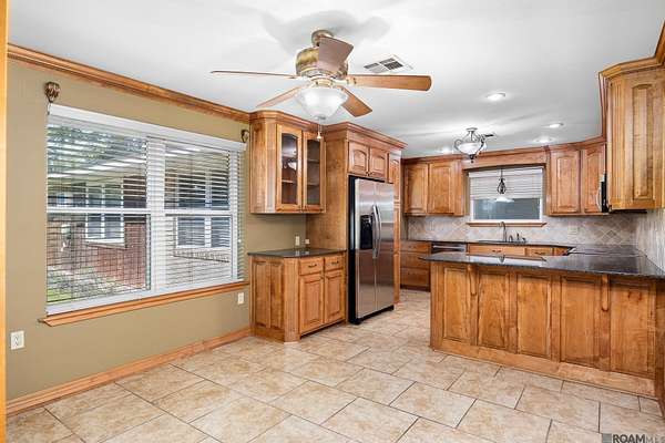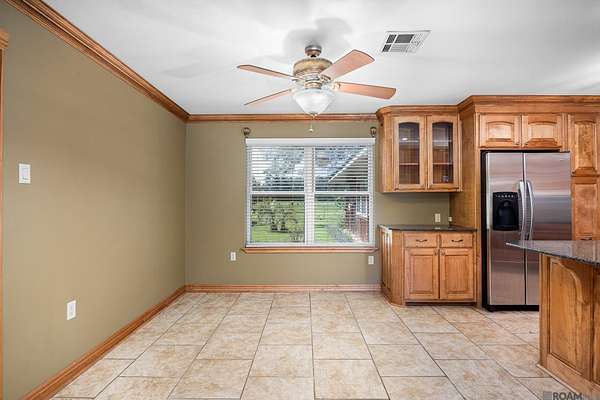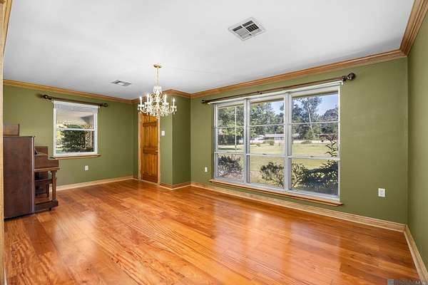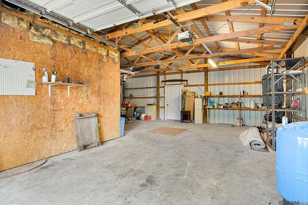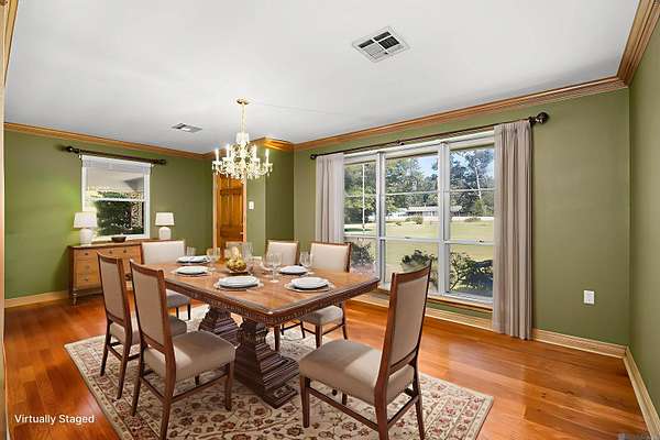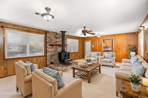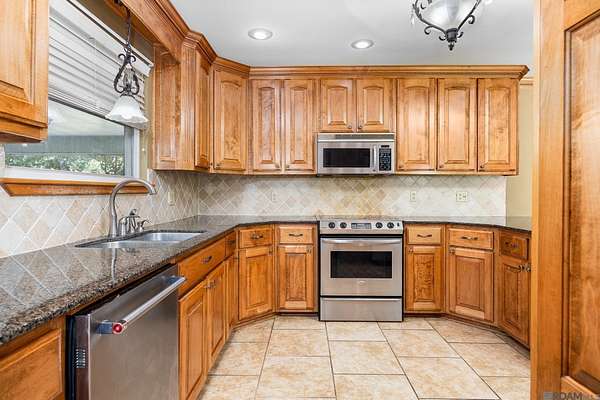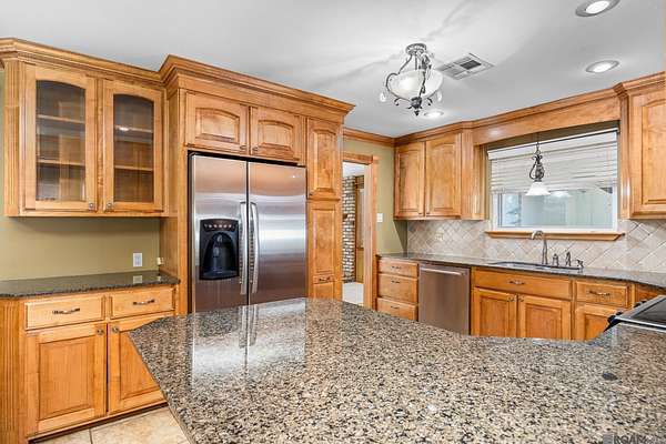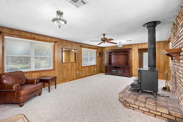 Welcome to this charming 3-bedroom home nestled on 1.5 acres surrounded by mature shade trees for peace and privacy. Inside, you'll find a spacious living room filled with natural light and anchored by a cozy wood-burning fireplace with a brick-accented wall and hearth. The kitchen is a true standout, featuring custom maple cabinetry with glass panel accents, granite countertops, a custom tile backsplash, stainless steel appliances, and a breakfast bar perfect for casual dining. Just off the kitchen, the open dining area provides plenty of room for gatherings, while the formal dining room boasts an oversized window overlooking the front lawn and beautiful wood flooring. Each of the bedrooms offers generous space and abundant closet storage. Step outside to enjoy the expansive backyard, complete with a massive 30 x 50 metal workshop that includes a kitchen, ideal for hobbies, entertaining, or extra workspace, and a 33 x 36 RV shed for added convenience. A whole-house generator provides peace of mind, and additional land is available for those seeking more room to expand. This property offers the perfect blend of country living, modern amenities, and versatile outdoor space, ready for its next owner to call home.