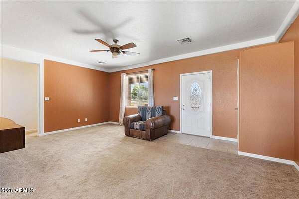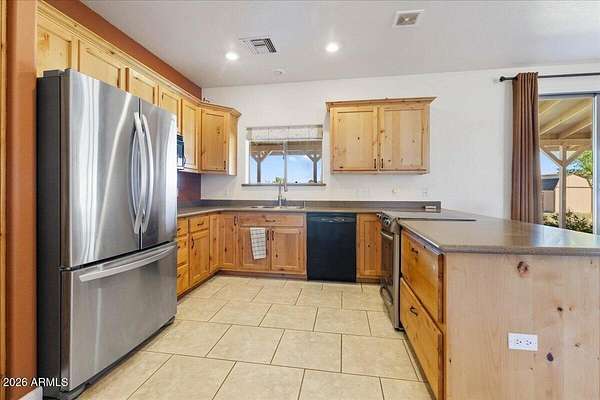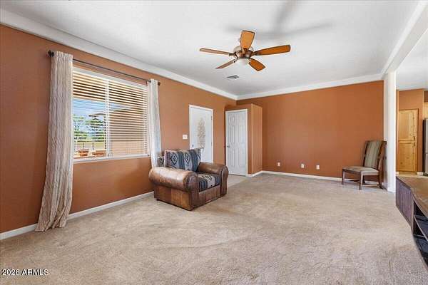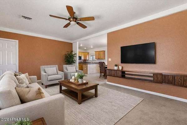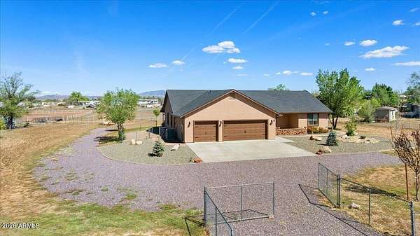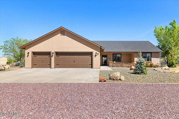 This well-maintained single-level home offers a desirable split floor plan with 4 bedrooms, 2 full bathrooms, and a powder room, all built in 2006. The oversized 25.5' deep x 31' wide garage provides ample space for vehicles, storage, or a workshop. The spacious U-shaped kitchen features Corian countertops, beautiful knotty wood cabinetry, and a large pantry--perfect for everyday living and entertaining. The primary suite includes dual closets and an en-suite bathroom with a double vanity and a walk-in shower. Generously sized bedrooms throughout offer comfort and flexibility. Recent updates include a new roof (2025) and fresh exterior paint (2025). Additional features include a sprinkler system and an efficient whole-house on-demand water heater. Situated on 2+ fully usable acres, the property is perimeter fenced and cross-fenced, with a separate dog run--ideal for animals and outdoor living. Large shed for more storage. Horse-friendly with plenty of room to roam. Enjoy stunning mountain views from both the front and back, plus a full-length covered patio for relaxing or entertaining. Located on a paved road for easy access. The property is serviced by a strong well, newly drilled in 2011. NO HOA!