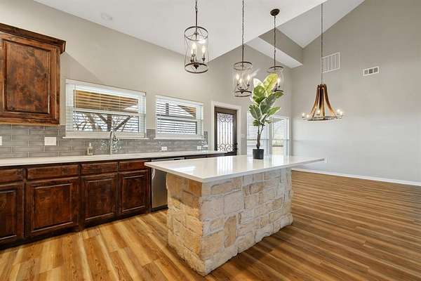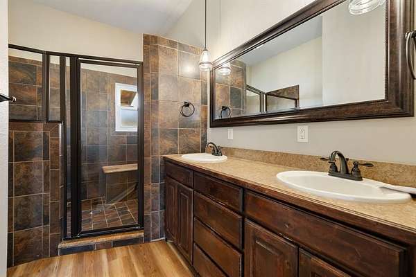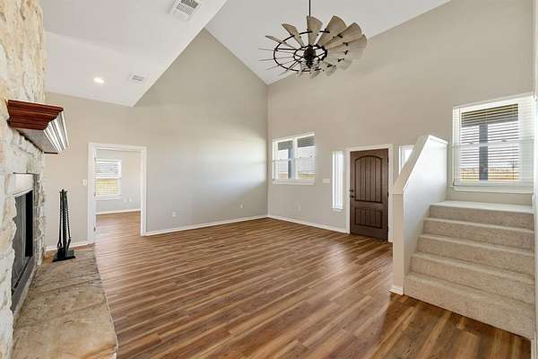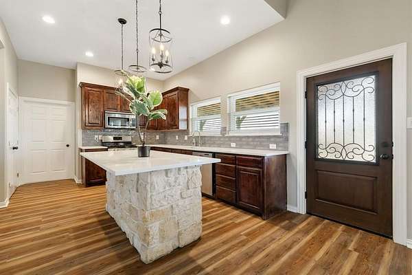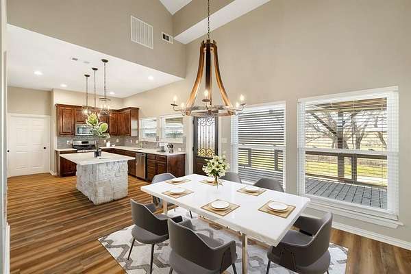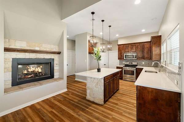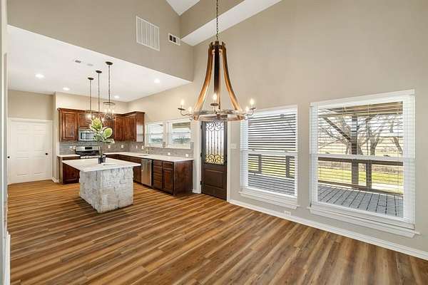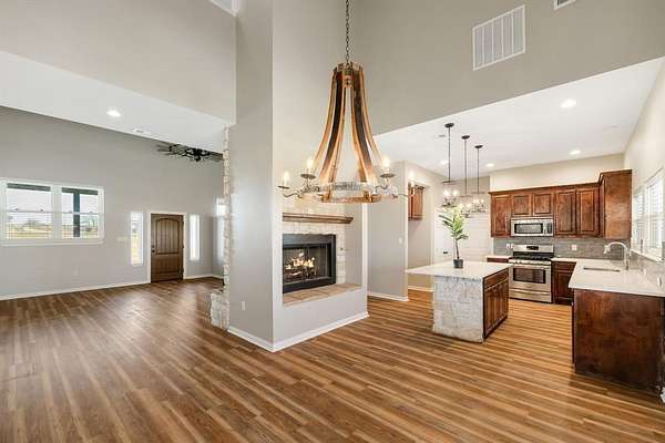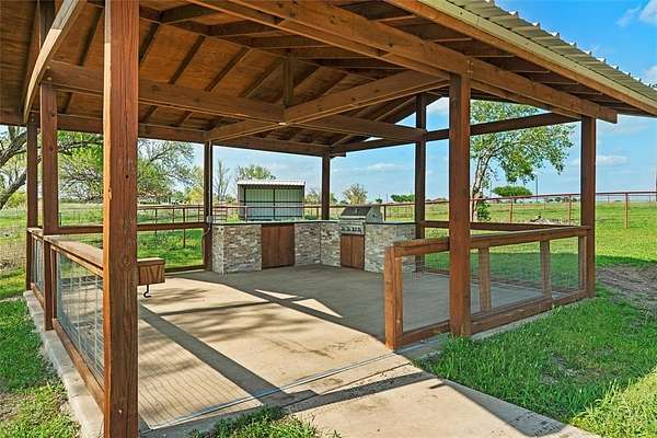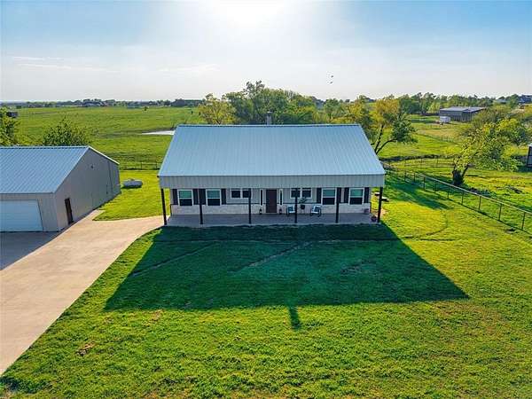 Experience refined country luxury in this private equestrian retreat set on 8 rolling acres beneath expansive Texas skies. This stunning 4 bed, 3 bath barndo seamlessly blends updated finishes with timeless rustic elegance, offering a lifestyle defined by space, privacy, & sophistication. The thoughtfully designed open concept living & kitchen area is both inviting & impressive, centered around a striking double sided fireplace that creates warmth & ambiance. New hardwood style LVP flooring enhances the main level, providing durability & style, while the kitchen showcases new quartz countertops, a classic subway tile backsplash, & curated rustic details that balance modern luxury with authentic ranch character. This floor plan features 2 bedrooms on the main level, including a serene primary suite, with new plush carpet on the staircase & throughout the upstairs bedrooms, creating a comfortable & private retreat for guests or family. 2 additional bedrooms up & 3 full beautiful bathrooms complete the home with functionality in mind. Outdoors, the gently rolling acreage is fully enclosed, including premium pipe fencing at the front, & is perfectly suited for an equestrian lifestyle. Enjoy established horse trails winding through the back of the property & throughout the community, offering the ideal setting for riding or peaceful trail excursions at sunset. Adding exceptional versatility, the property also features an oversized 4 car metal shop with insulation, heat & air, and water already plumbed, ideal for a workshop, equipment storage, hobby space, or expanded equestrian operations. Offering the rare combination of luxury finishes, usable land, & equestrian-ready amenities, this remarkable property delivers the serenity of country living with the convenience of nearby Denton shopping, dining, & schools. A truly distinctive opportunity to own a private Texas estate where elegance, lifestyle, & open space converge.