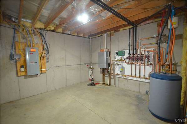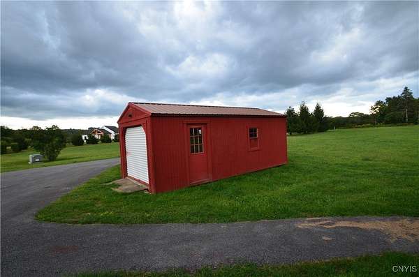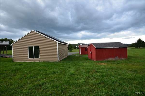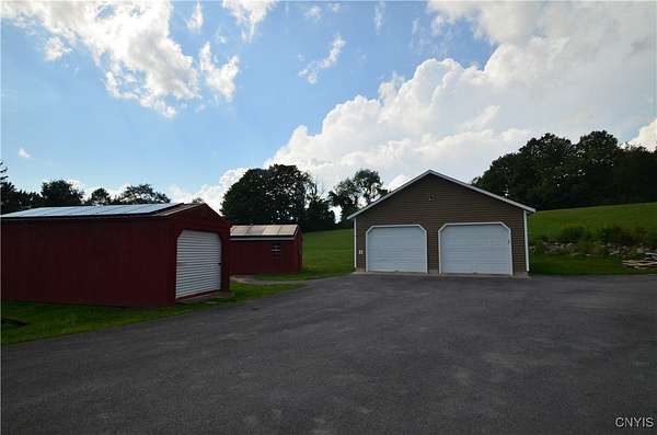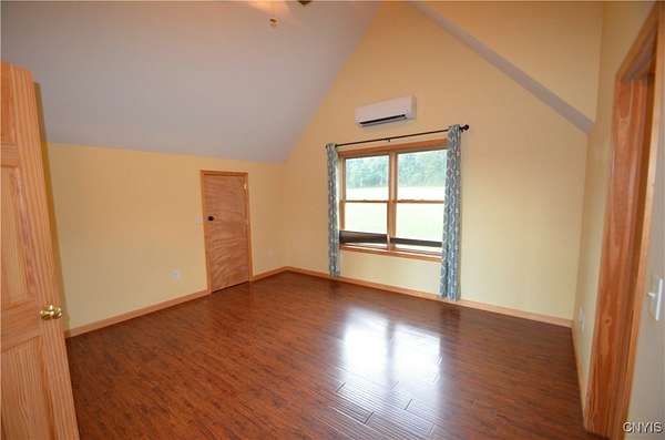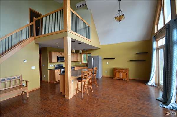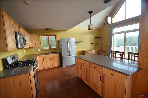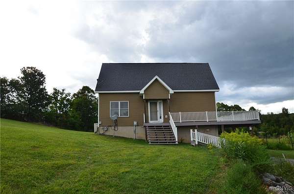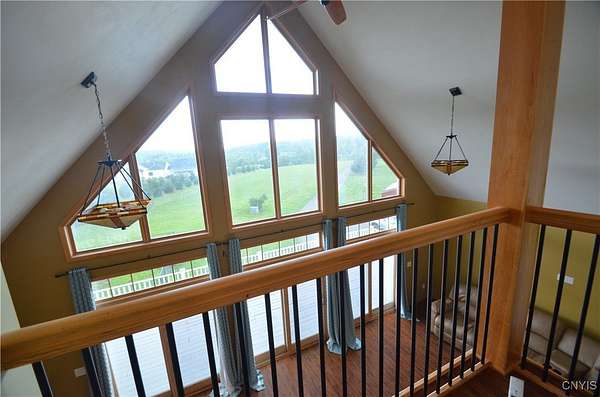 Situated high on a hilltop this magnificent home with three living levels offers views for miles all in the Marcellus School District. So close to the villages of Marcellus and Skaneateles this hard to find property features four bedrooms, three full baths, radiant floor heating, AC, solar panels for electric supply, two kitchens, and a spectacular wall of windows in the main level great room. The kitchen has all appliances with granite countertops and a custom built in breakfast bar area complete with Tiffany pendants and matching Tiffany ceiling lights. Cathedral ceiling in the great room and the master bedroom. A delightful loft area adjacent to the master bedroom offers 360 views of the countryside. All this with 6.43 acres of land!
