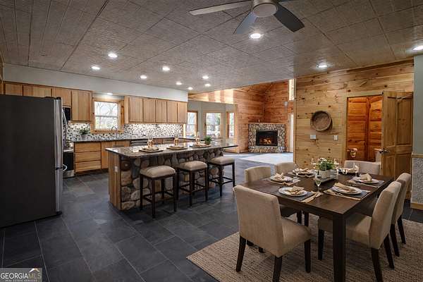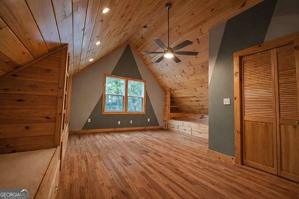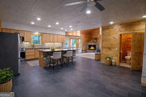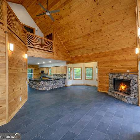 Four private acres with a creek, hot tub and sauna! This spacious mountain retreat offers rare balance of seclusion and accessibility, just a short drive to downtown Blue Ridge and nearby outdoor adventures. Freshly updated and more move-in ready than ever. Inside, the home welcomes you with soaring cathedral ceilings and a dramatic wall of windows that flood the great room with natural light and frame the surrounding forest. The multi-level layout was designed for both connection and retreat, offering bedrooms and full baths on every level, multiple gathering spaces, and a custom bunk room ready for family, friends, or visiting guests. The terrace level opens to a massive screened porch featuring a hot tub, while a tucked-away infrared sauna offers a private space for rejuvenation-perfect for unwinding after a day of hiking, fishing, tubing, or exploring the North Georgia mountains. Outside, expansive decks invite grilling, dining, and relaxing while overlooking the peaceful wooded setting, with Jackcove Branch meandering through the lower acreage. A Quonset hut with full RV hookups offers excellent space for storing an RV, boat, or other mountain adventure gear, and the property provides plenty of parking for gatherings and weekend visitors. Whether you're searching for a private full-time mountain home, a weekend escape, or a property that naturally lends itself to hosting, this retreat offers the space, privacy, and lifestyle buyers come to the Blue Ridge Mountains to find. Included features are a new roof, water heater, & HVAC units all within the last 2 years. Septic was serviced in July 2022 with limited occupancy/use since.