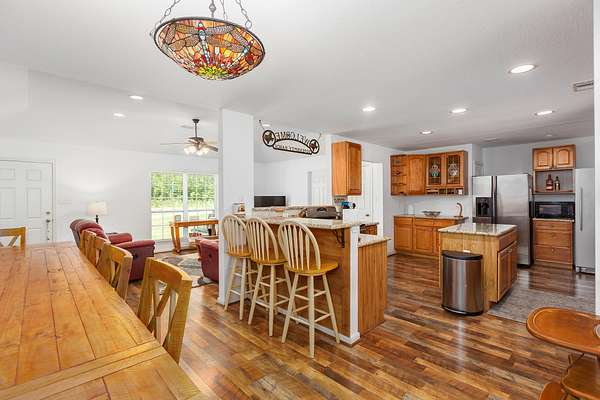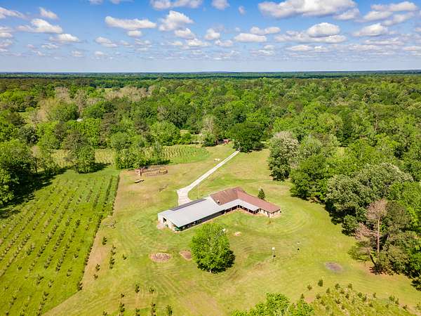 Serendipity Ranch - Discover a rare sanctuary where refined living meets the tranquility of nature. Spanning 34 acres of meticulously maintained pines that offers an unparalleled retreat, blending privacy, modern amenities and boundless opportunities for outdoor enjoyment. At the heart of the estate is a spacious 4-bed, 3-bath residence designed to capture the beauty of its surroundings. Expansive windows flood the home with natural light, offering breath-taking views. The thoughtful layout includes a private guest suite, with an en-suite bath, making it ideal for extended family, visitors or potential short-term rental options. Sustainable living is seamlessly integrated with solar power, enhancing energy efficiency while preserving the homes modern efforts. To boot, the property offers two fully stocked ponds and 3 year old pine trees cover the landscape.