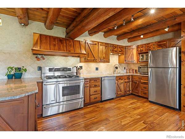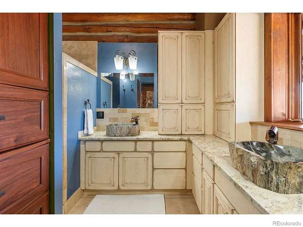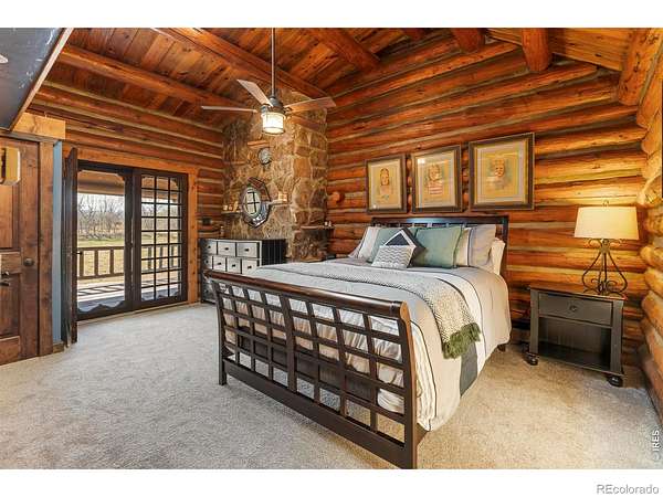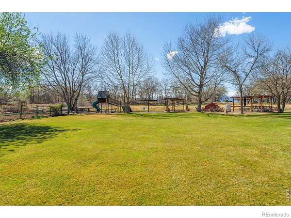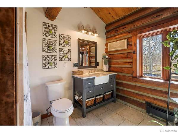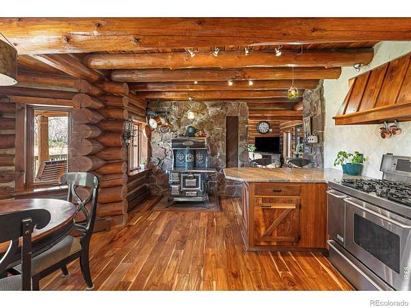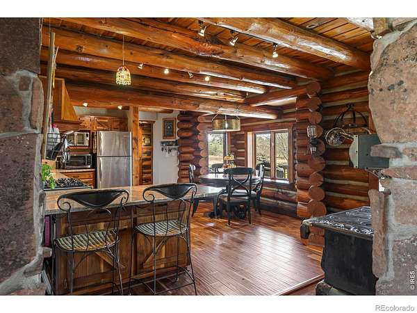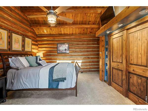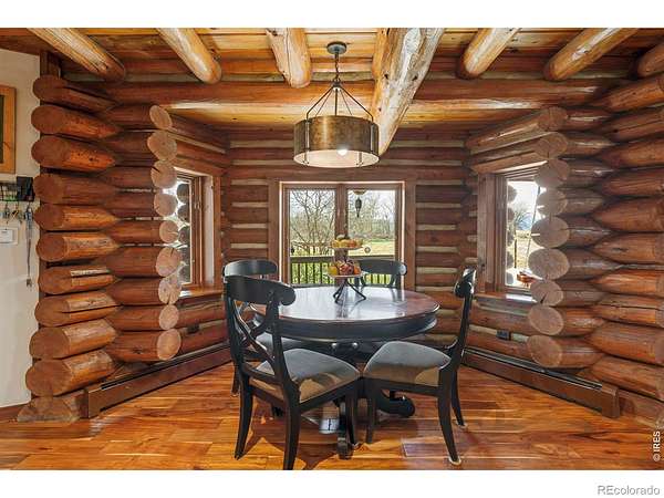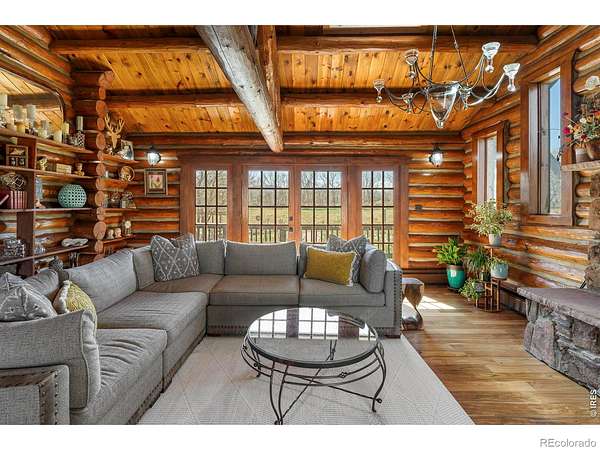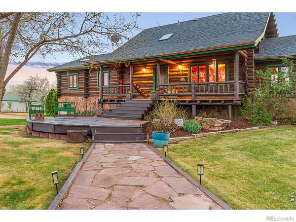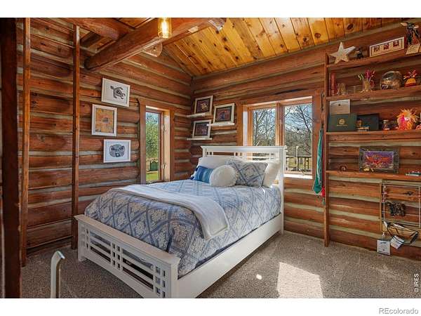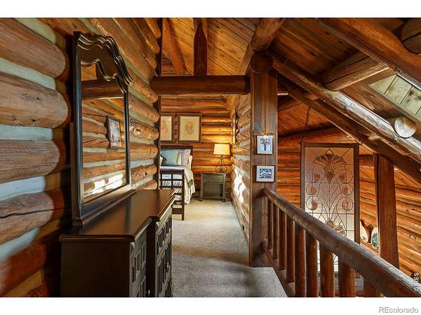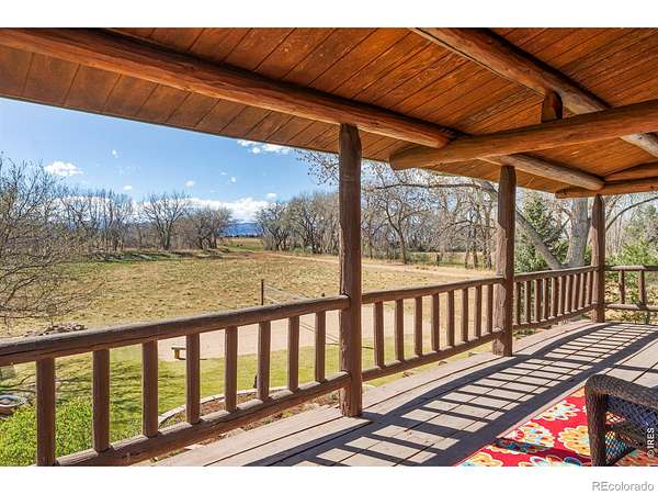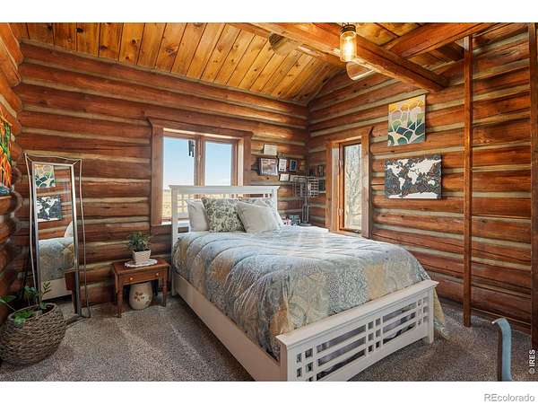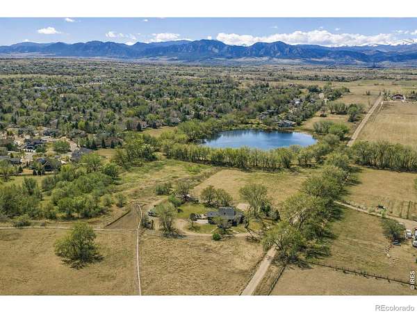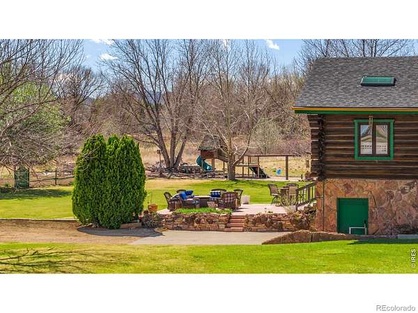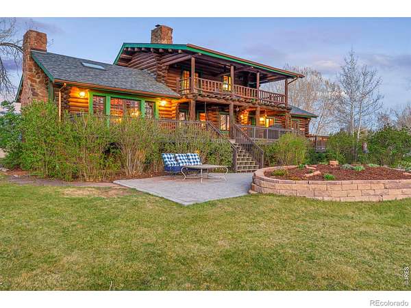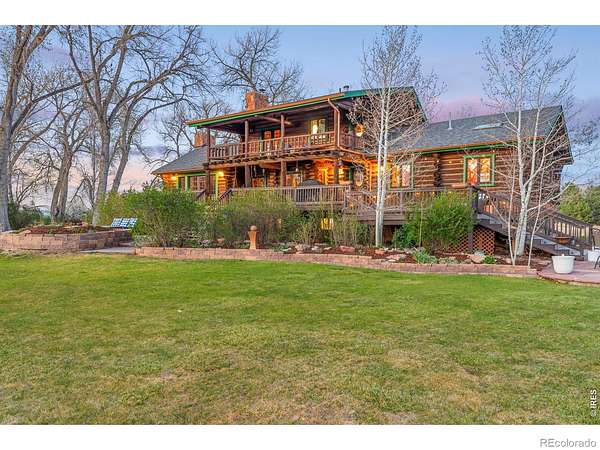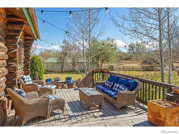 Whitecap Vista Ranch. Set on 4.3 private acres surrounded by open space, this rare Boulder offering is defined by land, location, and sweeping snowcapped views. Quietly tucked away yet within 15 minutes of downtown Boulder, the property captures an exceptional balance of seclusion and accessibility, with breathtaking mountain vistas creating a remarkable daily backdrop. The full log residence with stone accents embodies timeless Colorado character, with vaulted ceilings, skylights, and a wood-burning fireplace anchoring the light-filled living room. The kitchen features granite countertops, wood stove, sunny breakfast nook, and pantry with sliding barn door. Three main-level secondary bedrooms include loft spaces that connect above, creating a truly unique retreat ideal for play or creative use. Upstairs, the secluded primary suite offers new carpet, dual closets, and a private deck positioned to maximize the panoramic mountain views. Designed for gathering and recreation, the grounds offer an extraordinary lifestyle rarely found so close to town. Outdoor living spaces invite year-round enjoyment, from evenings around the fire pit to outdoor movie nights beneath Colorado's star-filled skies. Recreation options include volleyball, horseshoes, axe throwing, and expansive lawn space for games of every kind. Established raspberry patches, apple trees, rhubarb, perennial gardens, and room for horses, chickens, and large gardens create the feel of a gentleman's farm. A 4-stall barn with tack room and aviary completes the vision. The walk-out lower level features a rec room with wet bar, offering additional space for entertaining or relaxation. With four patio areas and endless room to roam, this is a truly private Boulder estate where views, land, and lifestyle converge.