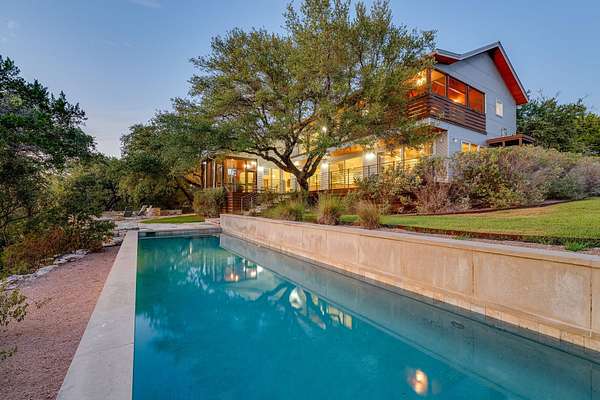 Waterfront Property. Experience Hill Country living in this stunning 4.4 Acre gated modern home on the Pedernales River. Picturesque Hill Country and Water views. 2 Slip covered Boat dock with storage. Priced well under TCAD Value. Main house 3,136 SF and Guest House 604 SF for total of 3,740 SF. Landscaped walkway to entrance provides a prelude to the updated and remodeled design throughout this home. Spectacular spacious living areas with high ceilings, striking chandeliers and walls of windows provide abundant natural light. Sliding glass doors offer seamless indoor-outdoor living ideal for entertaining. Crisp and polished interior blends sophistication with casual elegance. Living area has a wall of low profile built-ins with an integrated wine refrigerator and storage. The fireplace creates a warm and inviting ambiance for cool evenings. Chef inspired kitchen is equipped with a Viking range with propane cooktop and a stainless exhaust hood. Spacious breakfast bar with seating. Sliding barn doors open to a discreet kitchen area with dishwasher, sink, refrigerator, washer/dryer and storage. Large dining room with a wall of sliding doors ideal for family gatherings. Primary bedroom on the main level has access to the back deck for enjoying Pool, Canyon and River views. Elegant spa-like primary bath with soaking tub and beautifully tiled shower. Bunk room upstairs with beamed ceiling great for children or overnight guests. 2 bedrooms plus office/study area with 2 full baths upstairs. Enjoy a blend of rustic Hill Country charm and scenic Waterfront Views from the comfort of 2 screened porches and spacious deck. Convenient outdoor shower off deck. Relax by the firepit while finding serenity as the sun sets. Detached Guest quarters with separate entrance and full bath ideal for overnight guests or extended family. This breathtaking property is the epitome of Hill Country living at its finest. Lake Travis ISD