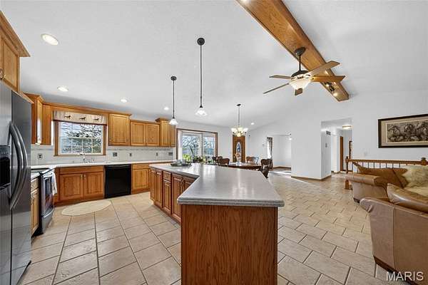 The main living areas are bright, open, and inviting, centered around a large kitchen with abundant cabinetry, extensive counter space, a center island, and seamless flow into the dining and living spaces. A gas fireplace adds warmth and character, while the open-concept design creates an ideal setting for both everyday living and entertaining.