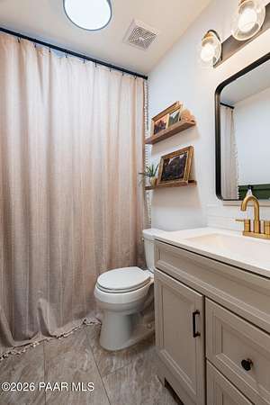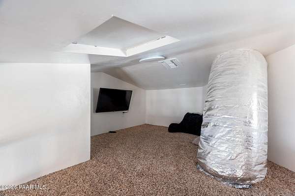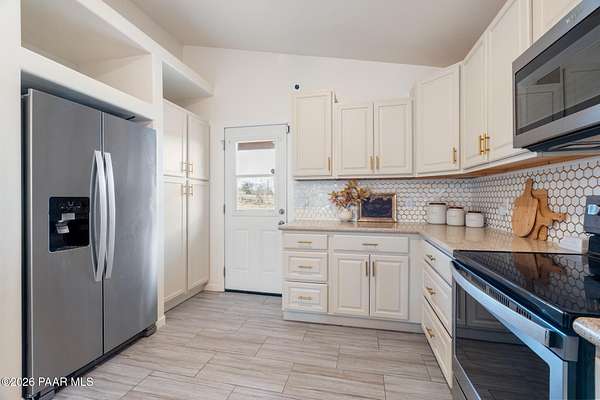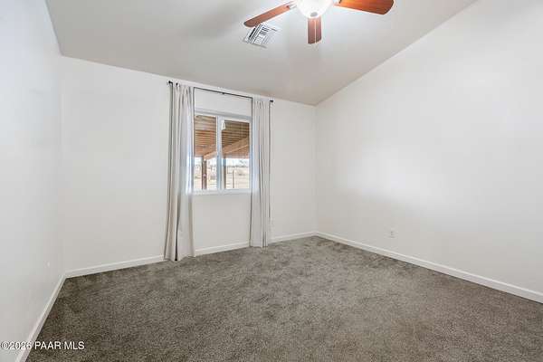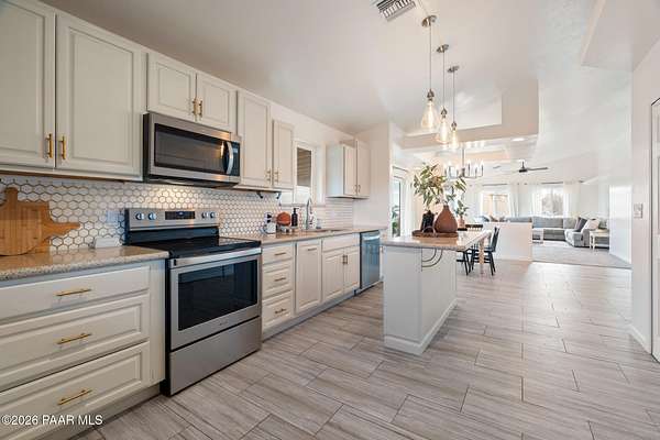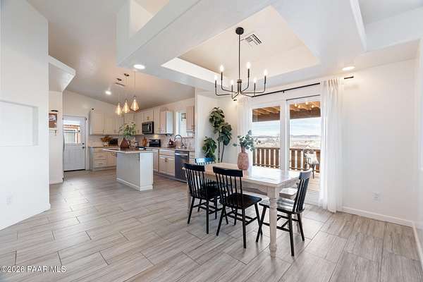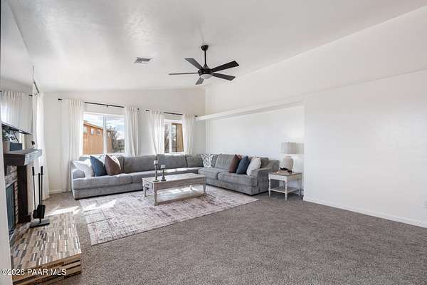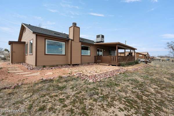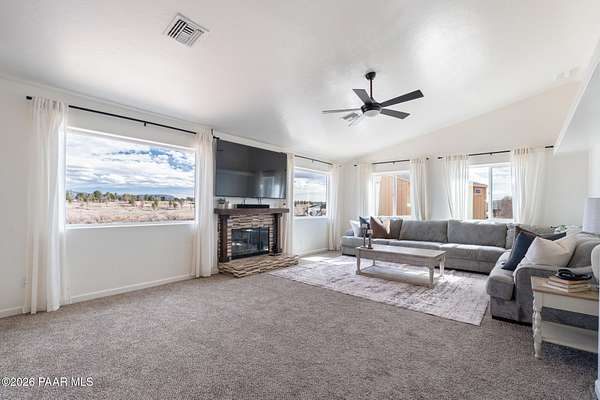 Set against the wide-open skies and rolling countryside of Chino Valley, this beautifully maintained 2019 home sits on a partially fenced 1.5-acre homesite, offering privacy, elbow room, and sweeping mountain views yet remains just minutes from shopping, schools, and convenient access to Highway 89 for an easy commute. The approach is warm and welcoming, with a charming flagstone walkway leading to a covered front deck framed by dormer windows and a lush real grass front yard, creating inviting curb appeal from the moment you arrive.Inside, a welcoming foyer opens to a bright, open-concept great room where vaulted ceilings and abundant natural light create an airy, comfortable atmosphere. Large picture windows capture the surrounding views, while a wood-burning fireplace with a tile surround and wood hearth serves as a cozy focal point for relaxing evenings or gathering with friends and family. The dining area features an inset ceiling with both indirect and direct lighting, adding architectural interest and ambiance as it flows seamlessly into the kitchen. Designed for both everyday living and entertaining, the kitchen showcases granite countertops, a decorative backsplash, stainless steel appliances including a smooth-top electric range, and a spacious pantry delivering both style and functionality for the home chef.The thoughtfully designed split floor plan enhances privacy. The generous primary suite offers a peaceful retreat with a large closet and an updated ensuite bath complete with dual sinks, granite countertops, and classic wainscoting detail. The additional bedrooms are comfortably sized for family or guests, and a versatile loft provides flexible space perfect for a home office, playroom, media room, or creative studio.Outdoors, the expansive property invites endless possibilities. There is a shed and ample space for RV parking, animals, gardening, or even future outbuildings all with the freedom of no HOA. A large back deck overlooks mature trees and panoramic views, providing an ideal setting to unwind and enjoy the quiet beauty of the surrounding landscape.Recent improvements, including a new roof in 2023, updated HVAC system, and new flooring, add peace of mind and immediate value. Whether you are searching for a full-time residence, a seasonal getaway, or an investment opportunity, this property offers space, comfort, and versatility in one exceptional countryside setting.