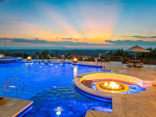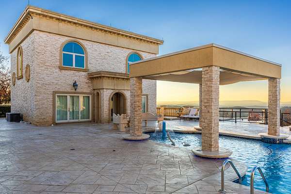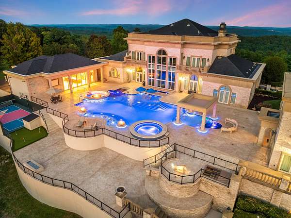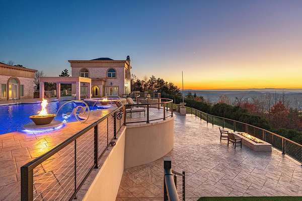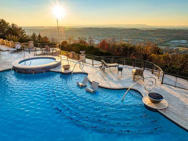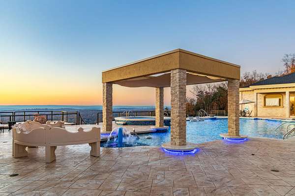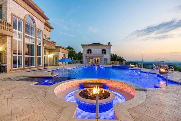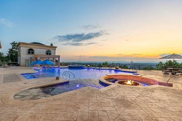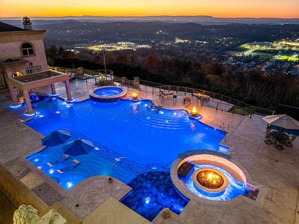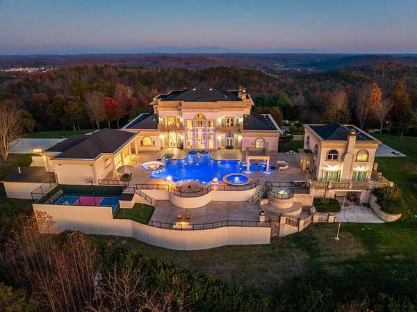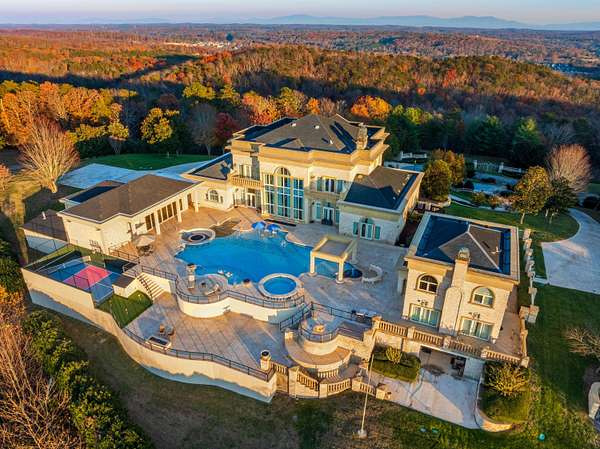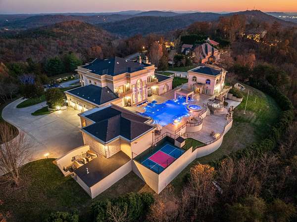 ''The Windy Hill Estate''. Prime Ooltewah, TN location. Gated privacy. Breathtaking views. ''Heavenly Views'' A rare find to say the least. Endless southeastern views of ''The Horizons,'' and/or southwestern views Lookout Mountain and city lights. Eleven acres at the top of White Oak Mountain, at the end of a cul-de-sac street. This luxurious estate features elegance and comfort (built like a fortress). Quality custom built featuring the finest craftmanship of stone throughout the estate (inside and outside). Main house consists of 8800 Sq Ft. 5 bedrooms, 5.5 baths. Luxurious master suite and luxurious master bath with his and hers walk in closets all on the main level. Soaring high ceilings throughout. Beautiful and/or elegant marble staircase thereby showcasing a grand chandelier. Elegant 2 story foyer. Elevator. Open floor plan features a piano bar that includes a wet bar, dishwasher, and ice maker. Separate dining room, family room, separate sitting room (living room), custom butler's pantry which features a dishwasher, ice maker, and sink. Breakfast room that features a Scenic City view. Second level foyer overlooking the grand marble stone staircase, along with the front entry foyer and at the same capturing eastern and western view. 5th bedroom is currently customized as an office with custom built-in cabinetry. All bedrooms feature full bathrooms. Custom, gourmet kitchen includes a Thermador gas cook top with warming shelves, Thermador double (wall) ovens and side by side built-in Sub-Zero refrigerator and freezer. Island with second sink and Kitchen Aid dishwasher. Main house features side rear entry attached 3 car garage. Large laundry room with sink, custom cabinets, built-ins, and pull-outs galore. Plantation shutters throughout. Custom trey ceilings throughout. House consist of Pella Windows and Doors. Lush landscaping with water fountains, flower beds, and retaining walls. The overall layout and/or presentation is simply elegant. The separate guest house consists of 2400 Sq Ft, 2 bedrooms, 2.5 baths, which includes panoramic views. The grand design outdoor entertainment area has too many features to mention in doing the subject justice. Multi-level pool side features are nothing less than spectacular. The grandeur display of quality and custom marble features is breathtaking. The pool and pool house features are all new and/or under construction and near completion. Pool side entertainment features are incredible: Unite (with pebble tech) heated pool and hot tub. Pool features zero entry and tanning deck 1 & 2. Two badu jets. Swim up bar to fire pit with custom sunken seating. 2 accent fire bowls flanking the pool side. Poolside basketball goal. Custom Mushroom foundation. Pool house/outdoor kitchen equipped with state-of-the-art appliances, allowing you to entertain guests with gourmet meals. All sports court includes basketball and pickle ball courts overlooking the western brow with scenic city view. The pool house features a theater room, a wine cellar room, and a full bathroom along with a gourmet kitchen and grilling with open air full retracting sliding doors to the pool, thereby capturing the scenic city, brow front views. Perfect for hosting poolside parties and enjoying a vibrant outdoor atmosphere. Providing endless entertainment options for you and your guests within this luxurious back yard oasis. All of the water features create a soothing ambiance. LED lighting creates an enchanting nighttime pool atmosphere with fire bowls, mushroom fountains, and waterfall via an integrated hot tub along with many customized features, all overlooking breathtaking views, yet with seclusion and tranquility. A private retreat with resort inspired luxuries.