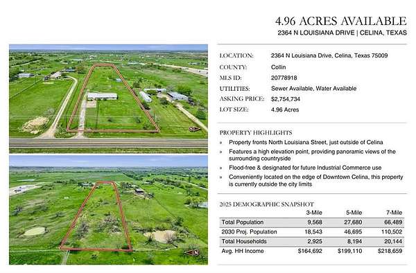 Est $17,239/moThis promising 4.9-acre investment property is located on North Louisiana Street, just outside of Celina. It features a high elevation point that offers panoramic views of the surrounding countryside. The land is flood-free and designated for future industrial commerce use. Additionally, there is a residence on the property that could serve as an excellent office space. Conveniently situated on the edge of Downtown Celina, this property is currently outside the city limits, with the possibility of acquiring additional acreage.