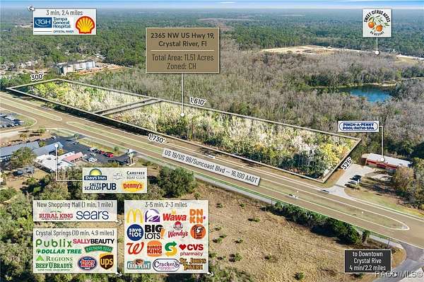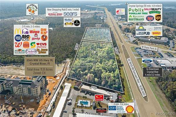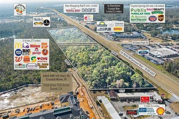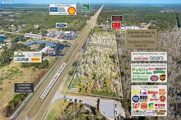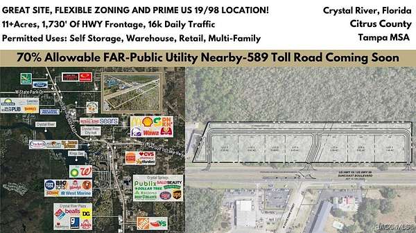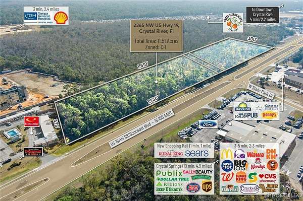 Bring your shovel and vision to this prime 11.51-acre commercial property in the heart of Florida's Nature Coast, located in the City of Crystal River, Citrus County. With 1,730+ feet of frontage along US Highway 19-a major thoroughfare with 27,500 AADT-this property offers exceptional visibility and accessibility for businesses looking to capitalize on the area's growth. Zoned CH (High Intensity Commercial), this versatile property is ideal for a wide range of commercial developments, including large-scale businesses, retail stores, quick-service and dine-in restaurants, hotels, professional and medical offices, self-storage facilities, gas stations, convenience stores, drugstores, warehouses, terminals, and shopping centers. Its strategic location provides an excellent opportunity for businesses seeking high traffic exposure and access to a rapidly expanding customer base. Positioned just north of Crystal River's Historic Downtown, the site is surrounded by trendy shops, local vendors, charming restaurants, and entertainment venues. The area is experiencing rapid economic growth, with significant new developments already underway. Among them, the former Crystal River Mall is being transformed into a 400-unit residential apartment community with mixed-use retail, bringing an influx of new residents and potential customers. Disclaimer: All information provided herein is for marketing purposes only and is not guaranteed for accuracy. Prospective buyers or tenants are encouraged to conduct their own independent due diligence. The seller, broker, and associated parties make no representations or warranties, expressed or implied, as to the accuracy or completeness of this information. All dimensions, zoning details, financial data, and other property-related facts should be independently verified. Please consult with appropriate licensed professionals before making any investment or purchasing decisions.