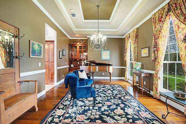 This stunning, magazine-worthy home looks like it stepped straight out of Southern Living. Thoughtfully designed with tall ceilings and rich hardwood floors, the open living and kitchen area creates a warm yet elegant space ideal for everyday living and entertaining. Office with wood accents adjacent to the entry way.