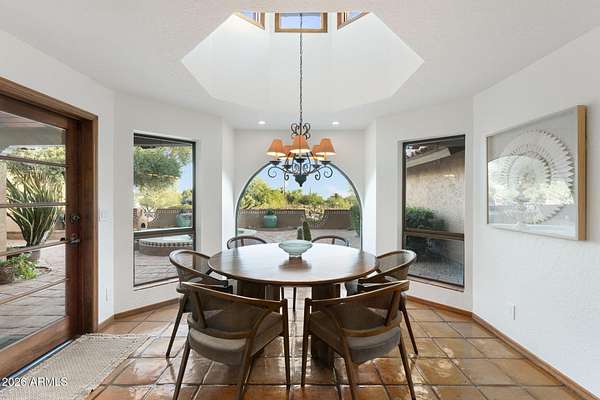 Discover a private desert sanctuary in the heart of Pinnacle Peak. Set on nearly three acres, this expansive Spanish-style estate captures the timeless charm of Arizona living while offering exceptional space, comfort, and panoramic natural beauty. A welcoming courtyard entry sets an elegant tone, leading into a thoughtfully designed floor plan featuring three guest bedrooms, a generous primary suite with fireplace and intimate seating area, formal living and dining spaces, and an expansive family and game room ideal for entertaining. The backyard is a true highlight designed as a personal retreat with a resort-style pool, expansive covered patio, and unobstructed views of iconic Pinnacle Peak. The expansive lot provides abundant opportunity for future enhancements, whether a guest casita, sport court, or custom outdoor amenities to suit your lifestyle. Pinnacle Paradise is experiencing a renaissance, with significant investment through luxury remodels and new custom builds on acre plus lots underscoring the area's commitment to privacy, open space, and long-term value. This quintessential Pinnacle Peak residence offers rare flexibility, enduring appeal, and limitless potential to create your dream desert estate. Furniture may be purchased on a Separate Bill of Sale