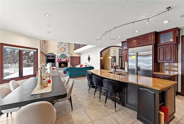 The gourmet kitchen is a chef’s dream, anchored by a 48-inch Wolf professional range, granite countertops, and premium finishes. Expansive living spaces are enhanced by soaring vaulted ceilings, stunning fireplaces, and abundant natural light, creating a warm yet sophisticated atmosphere.