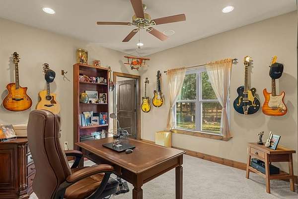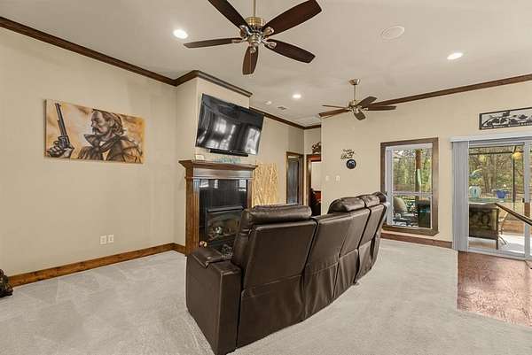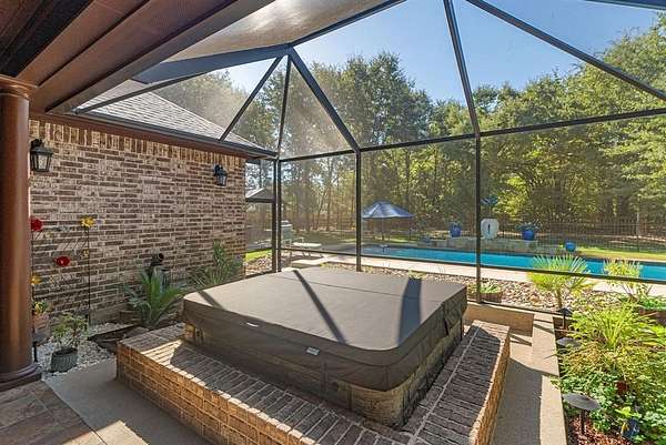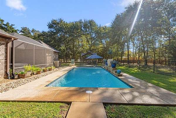 Welcome to this exquisite custom home, perfectly situated on three expansive lots, totaling just over two acres in a small cul-de-sac neighborhood. This stunning three-bedroom, two-and-a-half-bath residence boasts an open-concept den and kitchen, adorned with warm wood accents and elegant accent lighting throughout. The gourmet kitchen with large pantry, a breakfast bar, and great counter space overlooks the cozy den and fireplace. The oversized master bedroom is a true retreat, featuring a fireplace, direct access to an outdoor spa, and a spacious walk-in closet. Imagine game day or movie night in your state-of-the-art theater room featuring a Sony projector, a massive 136-inch screen and surround sound which extends throughout the house. Fido has his own dedicated pet room including a sink for bathing. No pets? This space would make a great bar or additional pantry space. The enclosed atrium has a large spa as well as space for grilling and lounging with direct access to the half bath. The outside oasis includes an inground pool complete with a waterfall, LED lighting, and freeze protection. Relax under the pavilion or in a swinging chair around the fire. This property is an entertaining mecca! The entire property is beautifully landscaped with mature trees and has a private well for irrigation ensuring lush St Augustine grass year-round. The home is plumbed for propane, allowing for easy conversion to gas for the kitchen cooktop, dryer, and outdoor grill. Additional features include a reverse osmosis system and built-in crushed ice machine in the kitchen, tankless water heater and spray foam insulation. The home has a Google Nest security system and an iron gate for added privacy. Enjoy space for everything with the oversized garage, built-out attic, and workshop in garage. Located near multiple East Texas lake resorts,2 hours from the MetroPlex, and 45 minutes from Tyler. Designed for entertaining inside and out, come see what secluded luxury is all about!