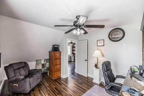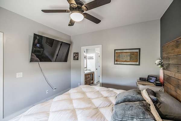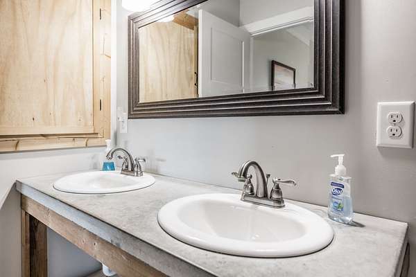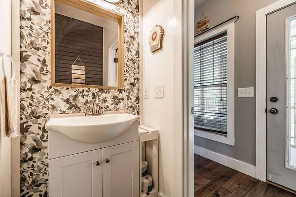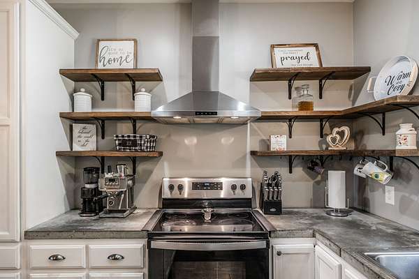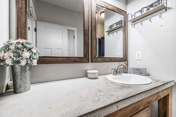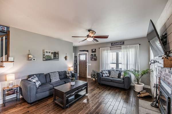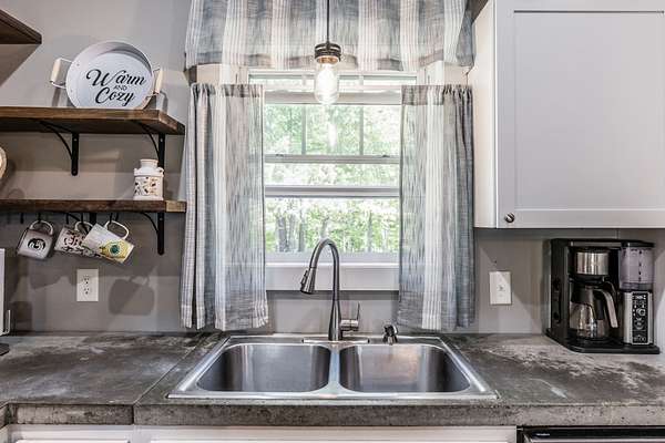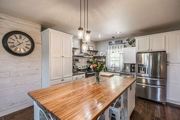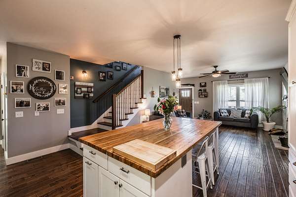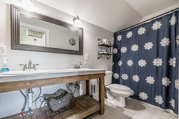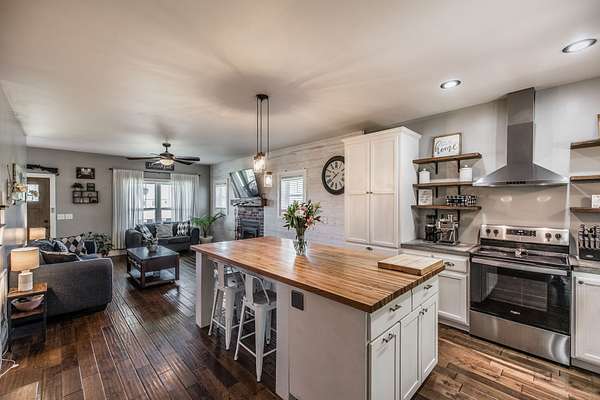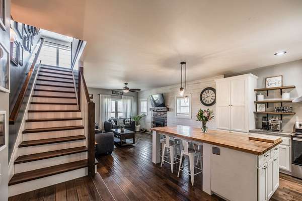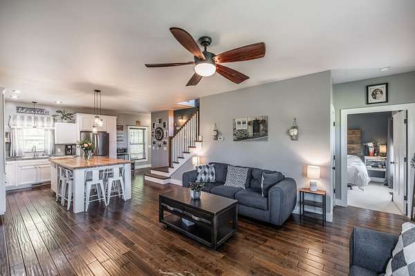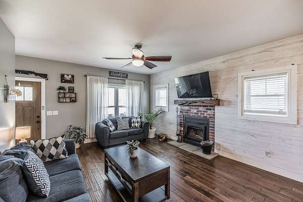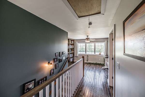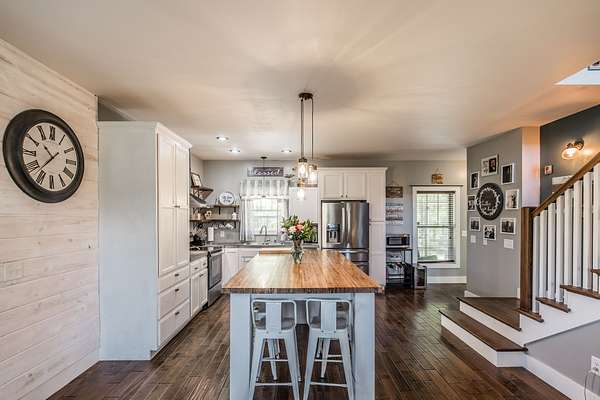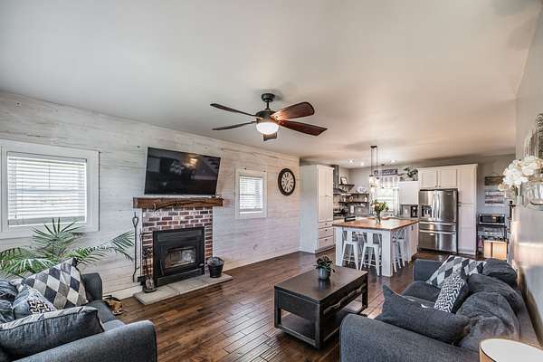 Inside, you’ll find hardwood floors throughout most of the home, a cozy wood-burning fireplace, and custom built-ins with lighting upstairs. The kitchen and bathrooms feature concrete countertops, adding a rustic farmhouse feel. Major updates include a newer roof (2 years), HVAC (one unit replaced last year), and a recently replaced water heater.