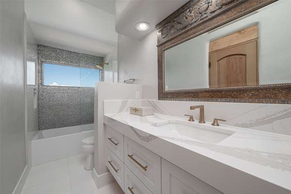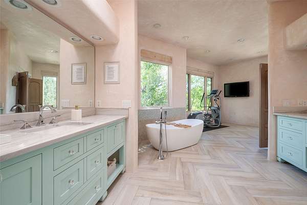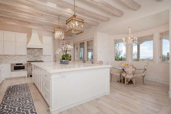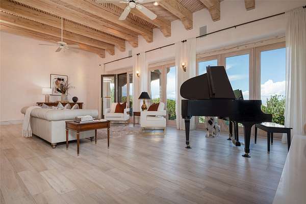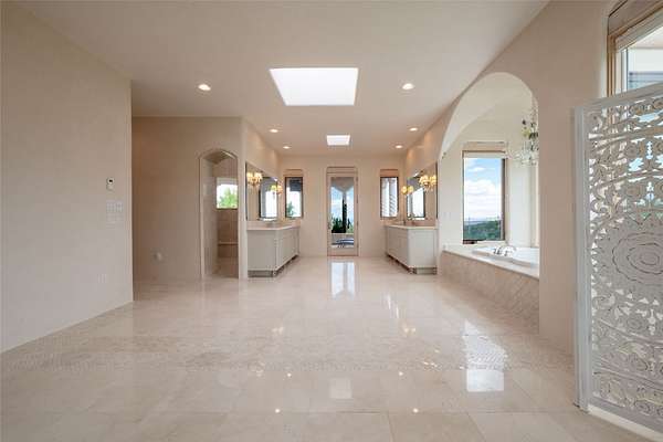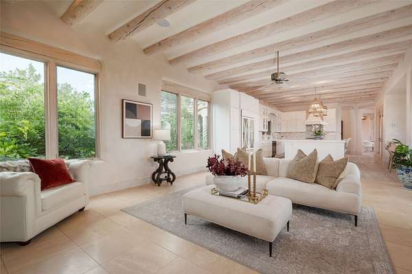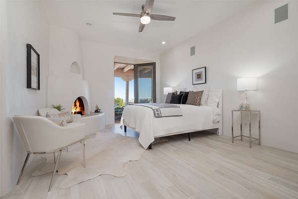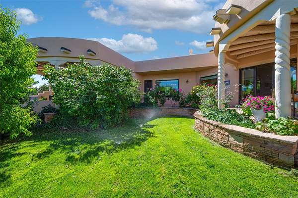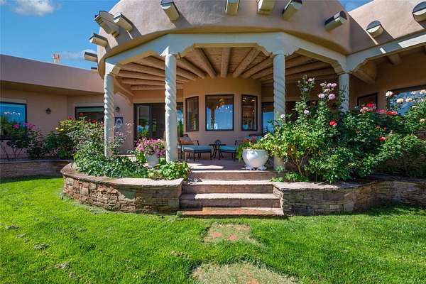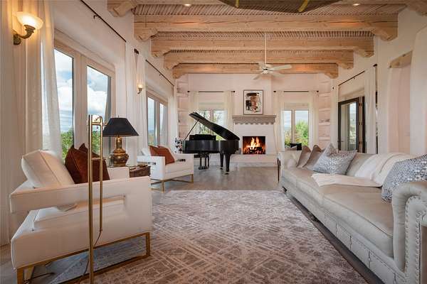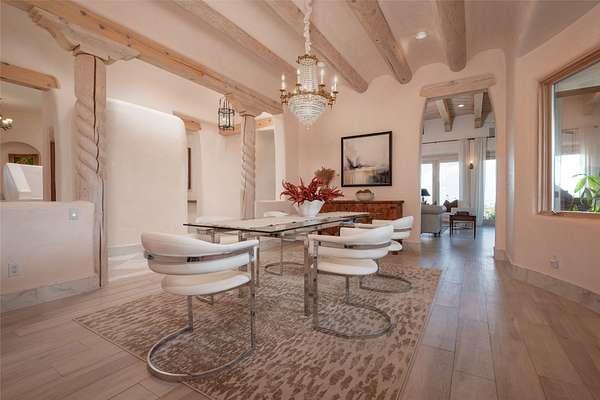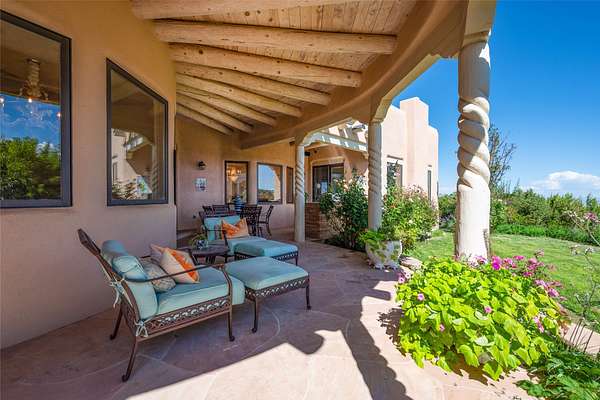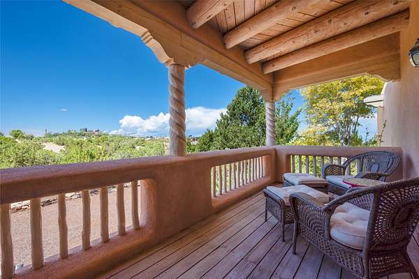 Grand Hacienda Winner and the unrivaled Belle of Tano Road redefines the essence of luxury living. Nestled behind exquisite handcrafted wrought iron gates, you are transported to a serene desert oasis, embraced by the splendor of nature, offering unparalleled privacy and sanctuary from the world. As you enter through handcrafted mahogany and wrought iron doors, the soaring ceilings and diamond plaster walls create an atmosphere of grandeur, while the Italian porcelain floors reflect a commitment to the highest standards of luxury and craftsmanship. Every detail has been meticulously curated for you. The great room, with its endless windows, invites you to bask in the breathtaking views of the sweeping mountains and the enchanting cityscape below, perfectly positioned above the exclusive enclave of Santa Fe. The sprawling estate houses two exquisite primary suites, each featuring spa-like bathrooms with soaking tubs, emperor showers, and ample space to have a powder room lounge, a meditation space, or a fitness area. Each of the four bedrooms is its own sanctuary, complete with fireplace and en-suite facilities, ensuring every guest feels like royalty and that their comfort and privacy are paramount. The gourmet kitchen is a culinary dream featuring custom cabinetry, Wolf range with double ovens and a warming drawer, Sub-Zero refrigerator, and a massive island seamlessly connecting to the outdoor cooking and dining spaces for effortless entertaining. Expansive grounds, nearly three lush acres, adorned with manicured lawns, vibrant rose gardens, and fruit trees, offer an idyllic setting for outdoor gatherings. These luxurious spaces provide not just comfort, but a lifestyle of sophistication. Immaculately maintained and thoughtfully expanded, this sprawling 6,700sq.ft estate is a testament to refined living. This is more than just a home - it is a lifestyle drenched in luxury and elegance. Design that speaks to the most discerning tastes and coveted desires. *Video*