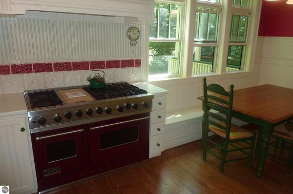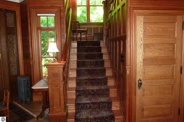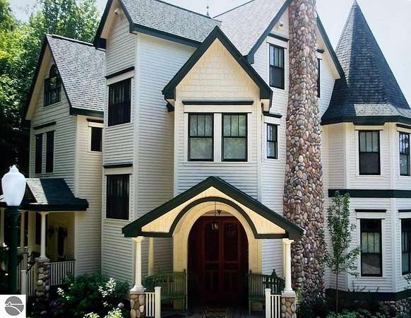 A large, 3 story, Victorian style home built in 2004 with 7 bedrooms, 4 & 1/2 baths, and approximately 5,000 sq. ft. of living space located about 2 miles north of Frankfort. The house is on a high bluff overlooking Lake Michigan. With 3 spacious levels of beautifully crafted wooden interiors, a large family can have its own private spaces or entertain large groups in the main level. The fully equipped kitchen has everything you need including a large walk in pantry. There is a large sunroom that catches the morning rays leading out to a full length deck. The huge master bedroom has a large bath with a jetted tub. A main floor laundry is just off the kitchen near the rear entrance. A hot water heating system is clean and quiet and located in the huge basement where there is lots of storage space, or room for a workshop, or room to create more living space, a game room, theater, wine cellar, etc. All of the listed dimensions are approximate, and there is currently a need for a new driveway access to the home, which must be approved by E,G.L.E. This one of a kind home is in a great location, right next to the CSA, just down the road from the Yacht Club, Point Betsie, and Crystal Downs Country Club, and only a five minute drive into town. Priced at $1,900,000.