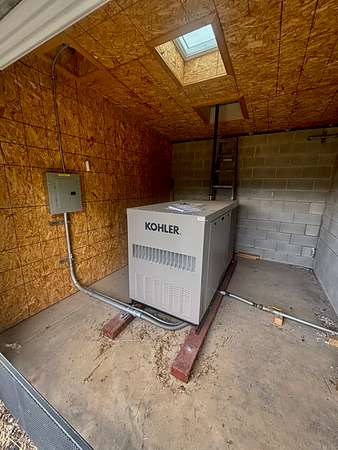 - Stone blockhouse housing a solar array, battery storage, and backup generator to meet all electrical demands.