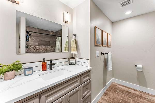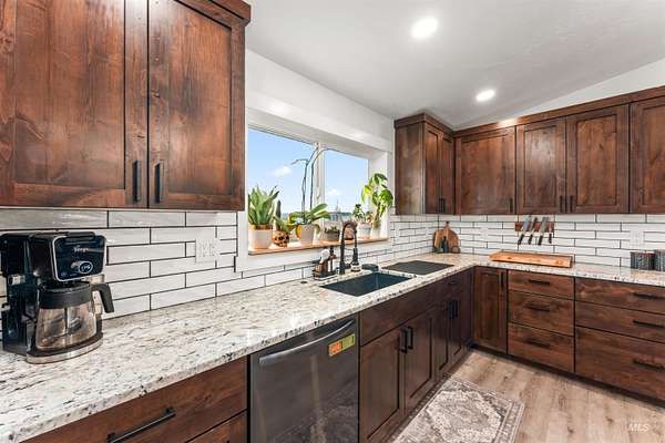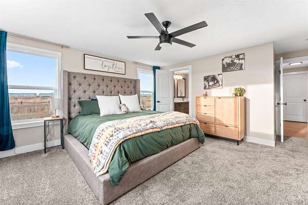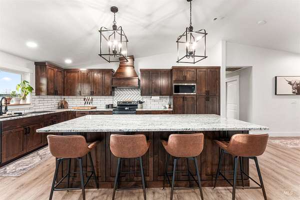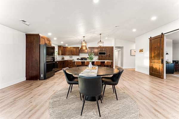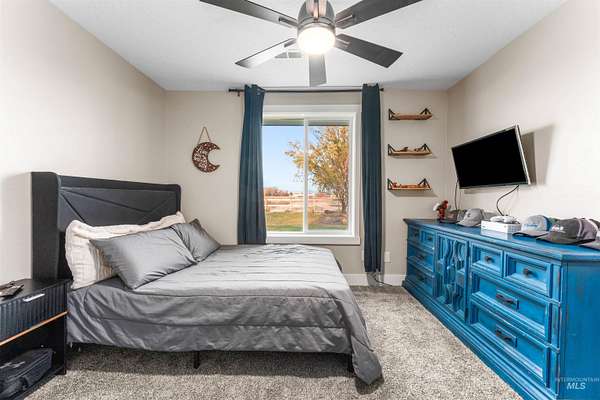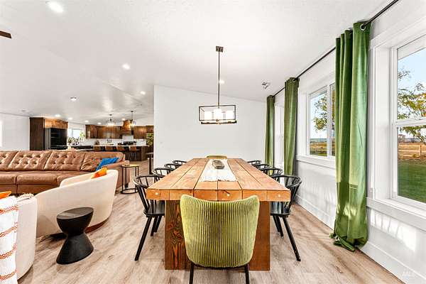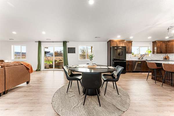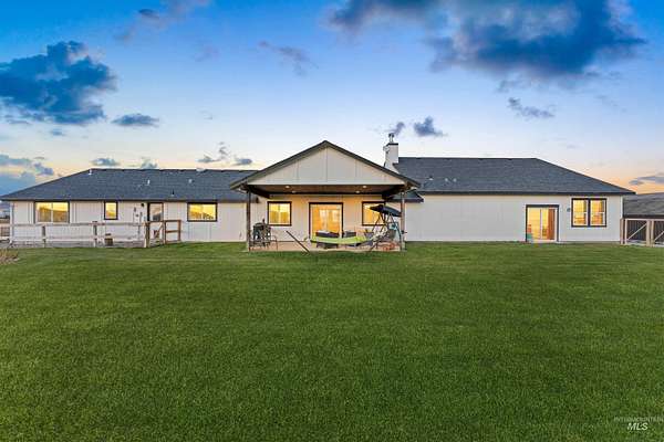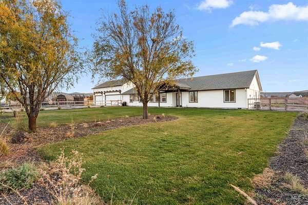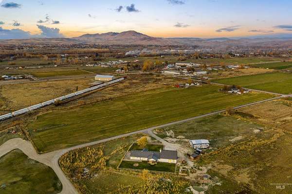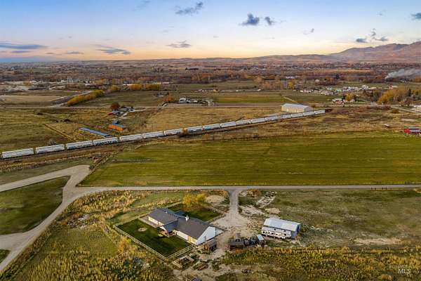 Discover refined rural living in this completely remodeled 5-bed, 3-bath retreat, complete with a brand-new 3-car garage on 9.03 acres with valuable water rights in the beautiful Emmett Valley. The setting is unparalleled ideal for horses, livestock, or anyone seeking wide-open space. Inside, you'll find over 2,900 square feet of thoughtfully designed living, finished with exceptional craftsmanship. The gourmet kitchen features a spacious island, while the expansive great room centers around a custom fireplace. All three bathrooms are elegantly updated, offering comfort and style throughout. The property provides ample RV parking and a generous 36'x48' barn/shop, perfect for equipment, hobbies, or extra storage. A large west-facing walkout patio invites you to relax and take in the sweeping views of the Emmett foothills. The fifth bedroom functions as a private attached living suite next to the garage completely new and was completed in 2023, with its own finished bathroom, AC split unit, in-wall heating, and separate backyard access. A truly exceptional property ready to welcome you home.