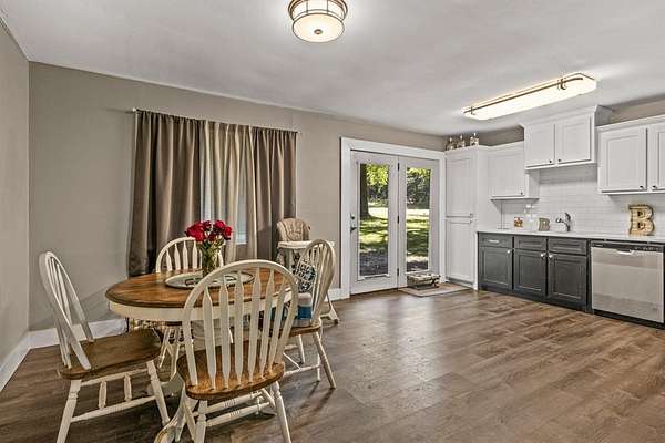 Step inside to a warm, inviting layout featuring updated flooring, a cozy living area with plenty of natural light, and a spacious kitchen with two-tone cabinets, subway tile backsplash, and stainless-steel appliances. The dining area opens to the backyard through French doors, perfect for enjoying your morning coffee while watching the deer roam.