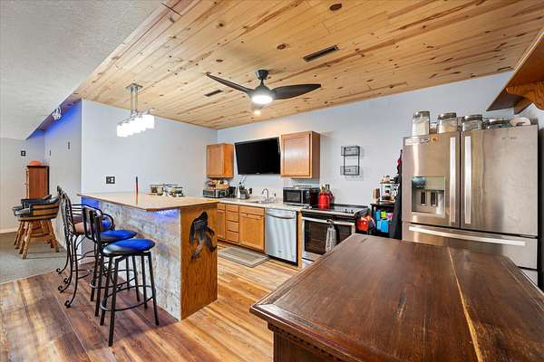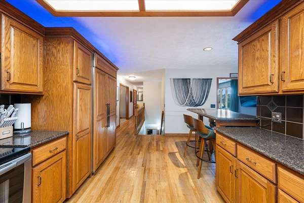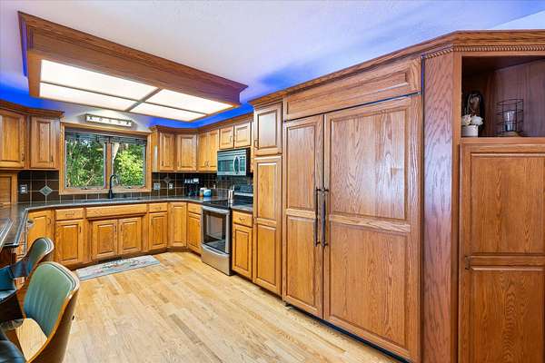 - Ceiling Fans, Dishwasher, Extra Built-Ins, Garbage Disposal, Microwave, Original Woodwork, Pantry, Refrigerator, Sky Light, Smoke Alarms, Solid Surface CNTR, Tile Floor, Walk-In Closets, Water Soft-Own, Wet Bar, Wood Floors