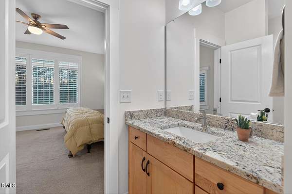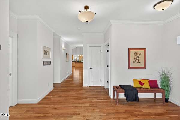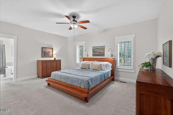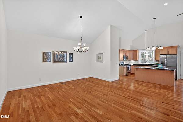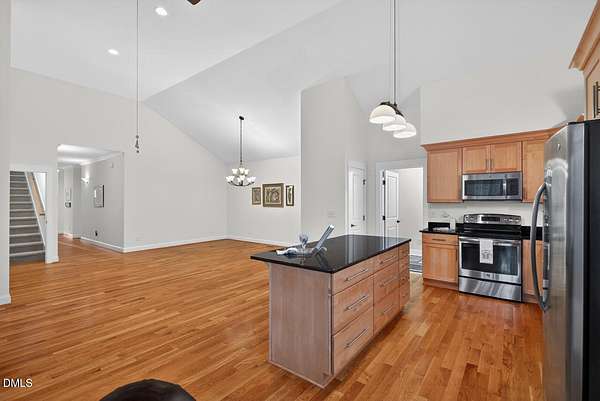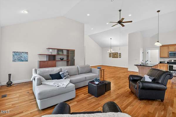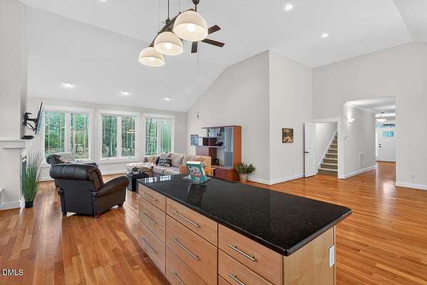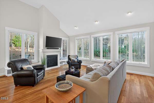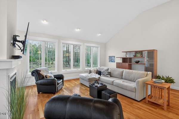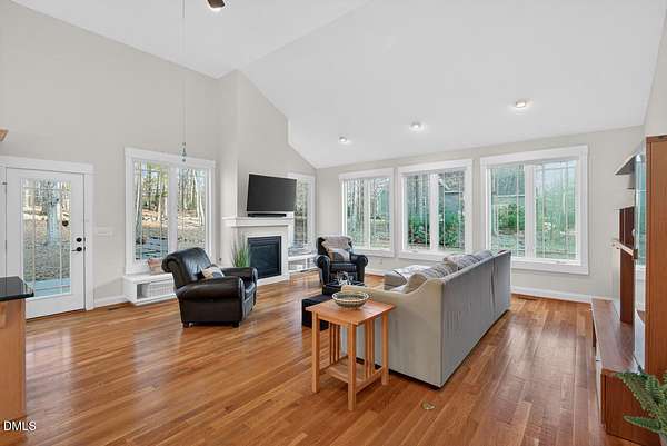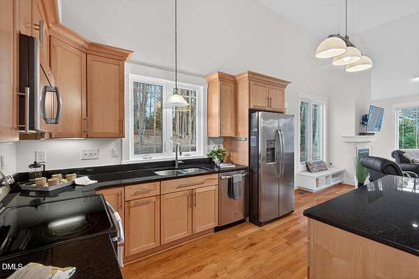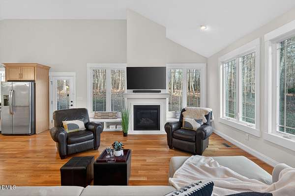 Easy one-story living meets thoughtful design in this well-maintained home built in 2014, offering 3 bedrooms and 3 full baths. The spacious, open layout connects the kitchen, dining, and living areas, creating an inviting setting for everyday living and entertaining. Hardwood floors run through the main living spaces, and the kitchen features granite countertops with generous prep space, with granite finishes continuing into the bathrooms for a cohesive look throughout the home. The first-floor primary bedroom provides a comfortable retreat, while the gas log fireplace adds warmth and charm to the living area. Step outside to the back deck overlooking the yard, complete with French drains for improved drainage. Additional highlights include a two-car garage, electric heat pump HVAC and a propane-supplied whole-house generator with a buried tank capable of powering the home for up to five days. There are about 3 miles of walking trails in this lovely, larger acreage community! Easy commute to Chapel Hill-8 minutes to Walmart and 13 mins to Southern Village. Washer, dryer, and kitchen refrigerator convey; refrigerator in the garage does not convey. HOA dues are $300 per year.