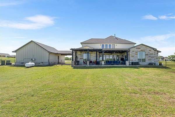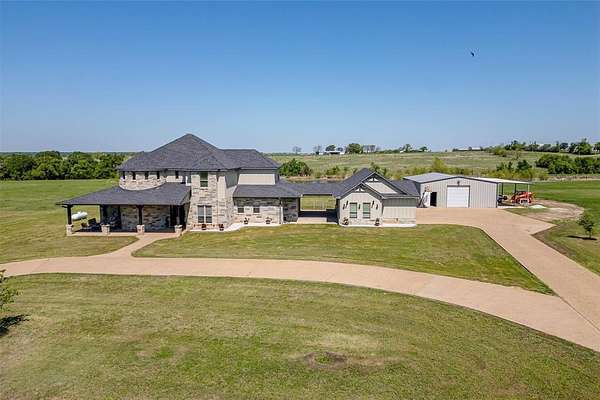 Welcome to your private country escape just minutes from the heart of charming West, TX. This elegant custom-built estate, offers 4,442 sq. ft. of thoughtfully designed living space on nearly 3 acres of scenic countryside. Tucked away from city life, this peaceful retreat features stunning water views, a private pond, and breathtaking sunset vistas from the covered back patio--perfect for relaxing or entertaining. Inside, you'll find two spacious living areas, vaulted ceilings, and an open floorplan with refined finishes throughout. The gourmet kitchen boasts a large island, gas cooktop, double ovens, warming drawer, microwave, dishwasher, disposal, vented exhaust, refrigerator, and an oversized pantry. A tankless water heater provides endless hot water, and a propane fireplace adds cozy charm to the main living space. The luxurious primary suite features a double vanity, walk-in closet, and serene backyard views, offering a perfect private retreat. Additional highlights include high-speed internet access, flat screen and sound system wiring, and a spacious laundry room with electric dryer hookup, full-size WD area, and washer hookup. A detached 2-car garage connects to the home via a covered breezeway, and a converted garage adds flexible space for a gym, hobby room, or extra storage. A circular driveway and side-facing garage enhance curb appeal, while a balcony, rain gutters, and multiple covered patios add both comfort and charm. Located in sought-after West ISD and outside city limits, this home benefits from no city taxes. The land features a 1496 SF shop with multiple large covered parking areas for storing all your toys, a beautiful pond perfect for fishing, and wide-open views in every direction. Make your appointment to view this spectacular home today!!