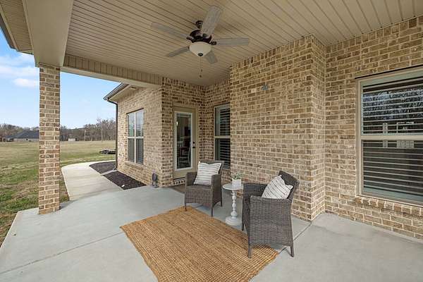 Hardwood floors grace the main living areas and stairway, while tile accents the wet areas for a polished finish. Step outside to enjoy the covered patio, where you can take in serene views of the expansive flat land and mature trees. Whether you're hosting a barbecue or simply savoring a quiet cup of coffee, this outdoor space is ideal for relaxation.