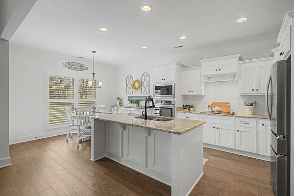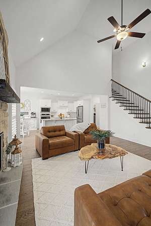 Step inside to discover a thoughtfully designed layout, starting with a grand living room featuring a soaring two-story ceiling and a stunning stone fireplace, perfect for cozy evenings. The heart of the home, the kitchen, boasts custom cabinetry and flows seamlessly into both the formal dining room and a sunny breakfast nook. Plantation shutters throughout add an extra touch of sophistication.