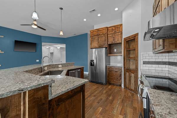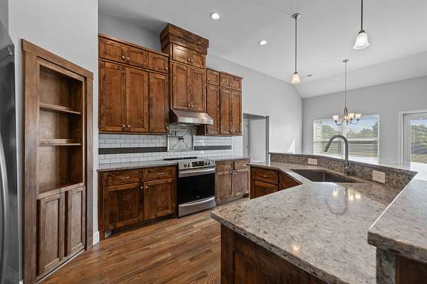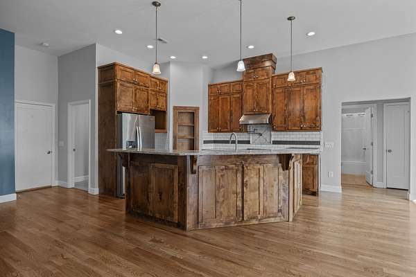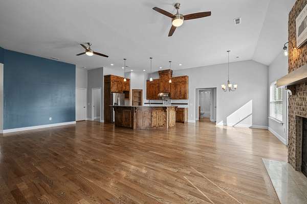 Inside, you'll find real hardwood flooring, soaring ceilings, and a cozy wood-burning fireplace anchoring the living area. The kitchen features a large island, stainless appliances, and a hidden pantry--perfect for both daily living and entertaining. The spacious primary suite boasts double vanities and a tiled shower, while the additional bedrooms include generous walk-in closets. A dedicated office and utility room add function and convenience.