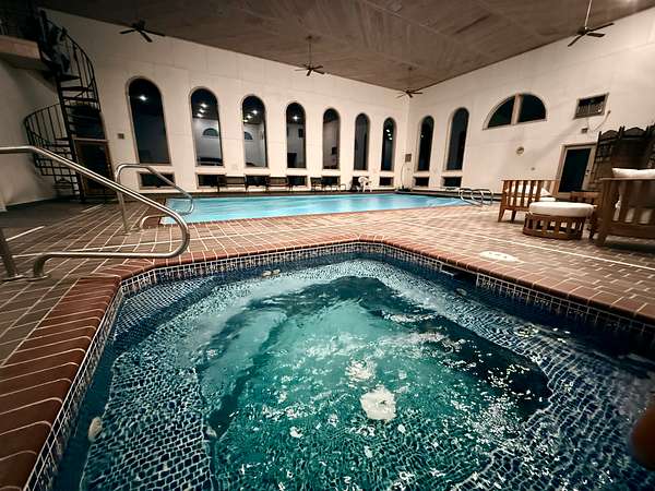 The main level features 2 studio apartments, each with its own bathroom, a spacious master suite with a Jack and Jill bathroom, a formal living area, two dining areas, a family room, office space, a half bathroom off the foyer, and a chef's kitchen equipped with high-end appliances. Unwind in the private sauna, hot tub, and indoor heated pool.