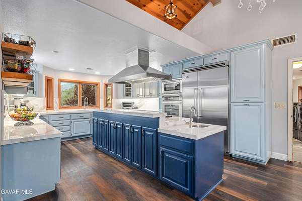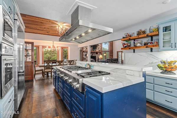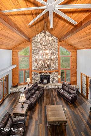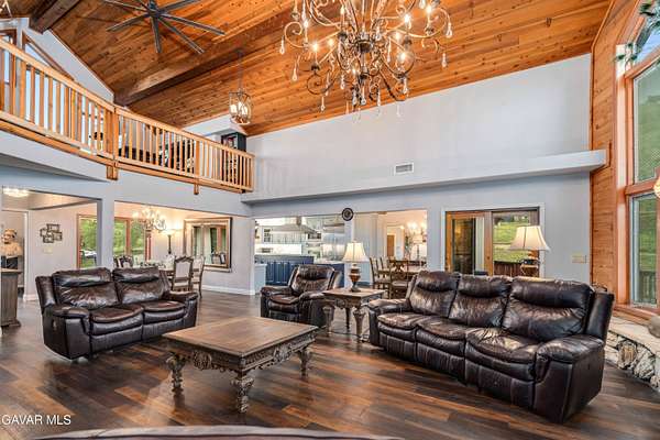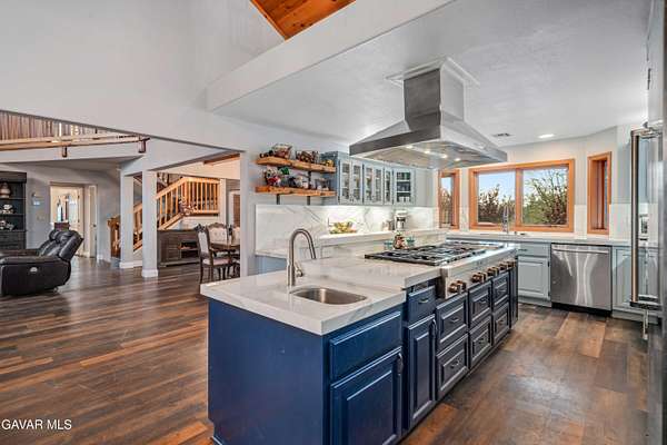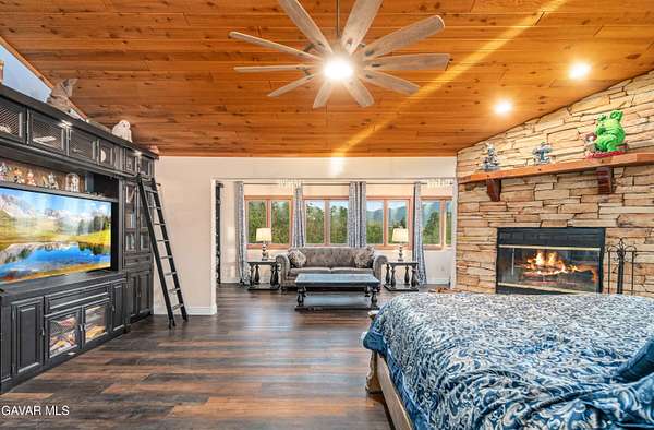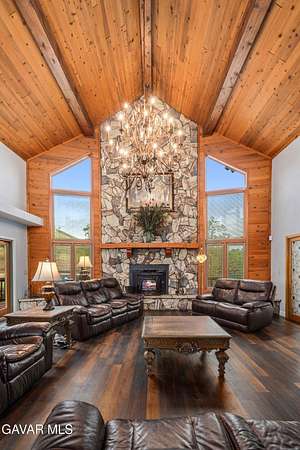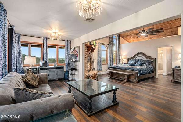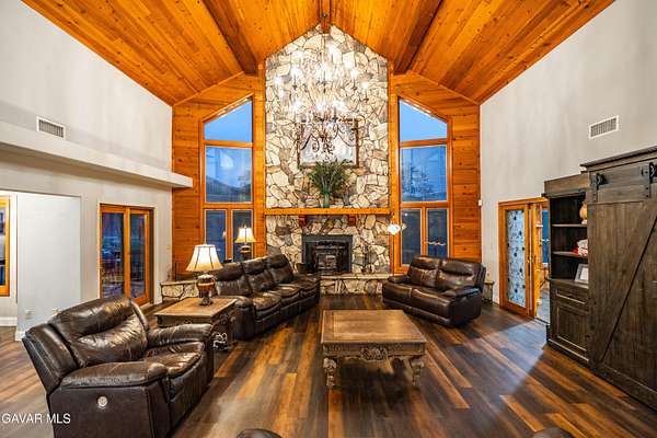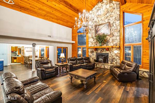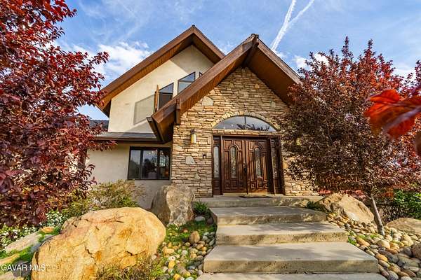*LIVE BEAUTIFULLY* Tehachapi Luxury Sprawling Sanctuary w/ 5 Acres, 3 Levels, A 4 Car Garage, Massive Entertainment Lounge, And Equestrian-Ready Grounds! This fully renovated estate offers the ultimate blend of luxury, space, and functionality with breathtaking views of rolling mountains and endless possibilities for multi-use living. Step inside to soaring vaulted wood ceilings that rise above a stunning floor-to-ceiling stone fireplace, creating a grand and inviting first impression. The gourmet chef's kitchen has been fully renovated and showcases quartz countertops and a massive center island with a prep sink. It also features a farmhouse sink, stainless steel appliances, and a professional-grade oversized gas range with a stainless steel hood vent. Abundant natural light fills the space, and a huge walk-in pantry provides ample storage. The expansive layout features multiple living spaces, including a versatile loft and a truly impressive primary retreat on the top floor. This oversized retreat offers high ceilings, walls of windows with stunning views, a fireplace, a private sitting area, and a large walk-in closet. The spa-like primary bathroom features a soaking tub, walk-in glass shower, and dual vanities. The lower level is an entertainer's dream with a massive lounge, full wet bar with built-in wine storage, fireplace, private gym, sauna, and its own bathroom. Designed for both comfort and efficiency, the home includes extensive upgrades throughout. Outside, the property is fully equipped for ranch living with a barn, multiple sheds, oversized chicken coops, animal shelters, fully fenced grounds with individual corrals, and a pre-plumbed garden area with its own water pump. The expansive driveway offers RV access and accommodates up to 3 RVs, plus a Tesla charger in the main garage. Experience elevated country living with luxury finishes, space, and room to live and entertain.