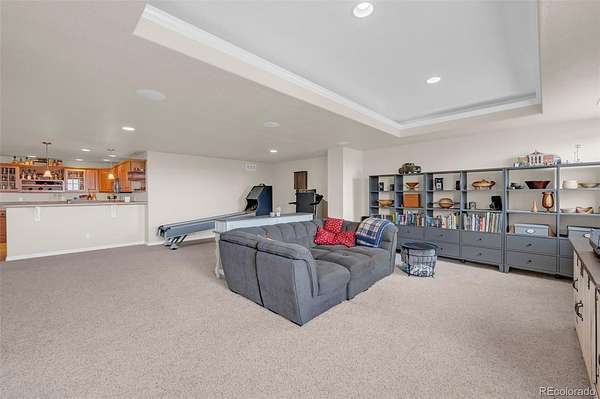 Step outside to your very own oasis; you'll enjoy quiet nights, with big Colorado starry skies around the fire pit, panoramic mountain views from your front yard and wide open rolling hills from the covered deck. Entertain on the stamped concrete patio with built-in BBQ, or unwind in the garden-level basement featuring a media room, wet bar, and exercise/craft space. (This space could also be a separate living space for multi-generational living!) Zoned for horses and surrounded by nearly 400 acres of open space with equestrian and walking trails and places to explore, this property offers the perfect blend of serene country living and modern convenience.