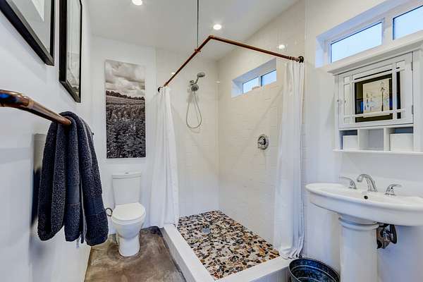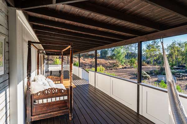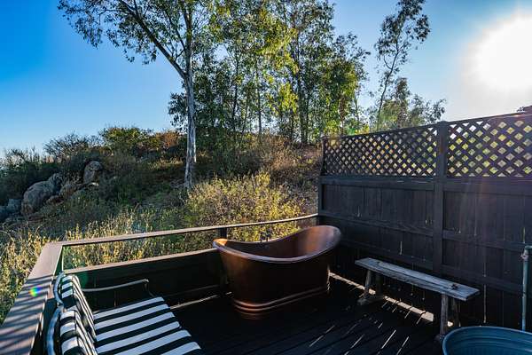 The ranch has a quaint one-bedroom modern farmhouse. Lounge on the oversize wraparound porch, overlooking the historic 21,000 acre Ranch Guejito, the last privately owned Mexican land grant. The farmhouse has a wood-burning stove for those cool nights, and is equipped with a modern kitchen and bathroom. The upstairs loft bedroom has a clawfoot bathtub and views of rolling hills. Look out onto mature trees, including blue gum eucalyptus, lemon eucalyptus, coastal Live Oaks and the rare Engleman Oak. There are no endangered species or plants on the property. You might spot hummingbirds gathered around black button sage, or in the pollination garden. "Bee Hill" is a perch that has been used by beekeepers to develop a thriving honey yield. The ranch provides a safe home for mountain lions, golden eagles, mule deer, coyote, bobcat, quail, road runners, hawks, owls, and wild turkeys. The rich presence of wildlife gives you a true sense of being in the wild West.