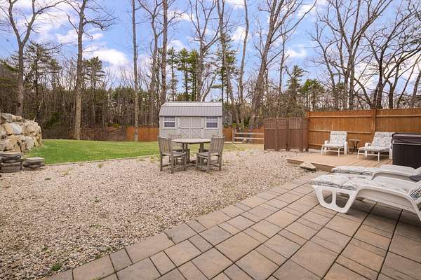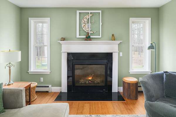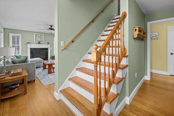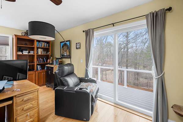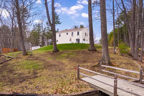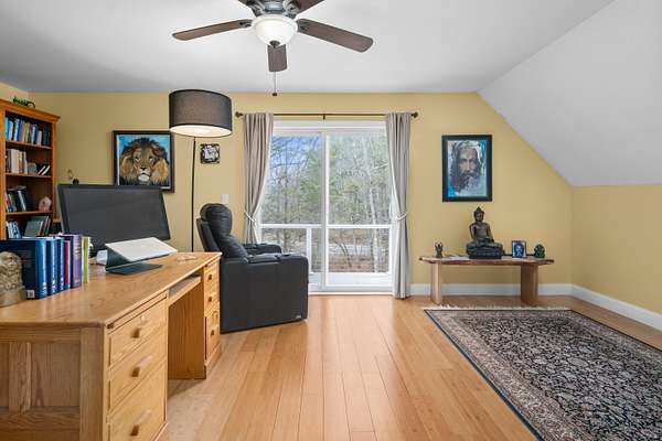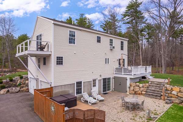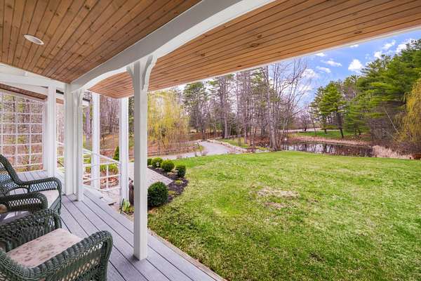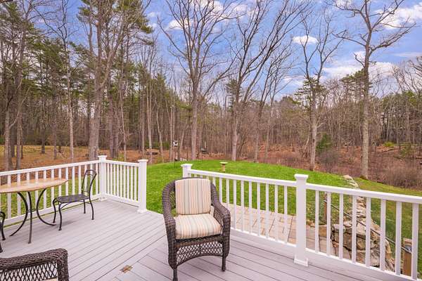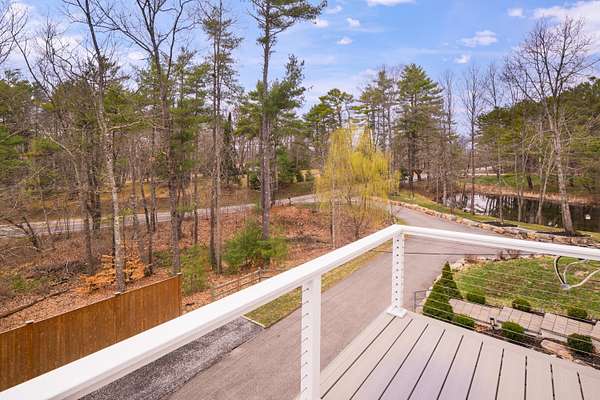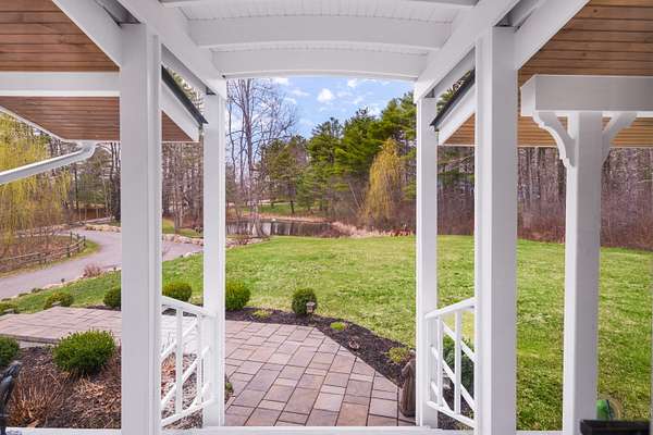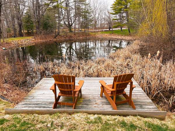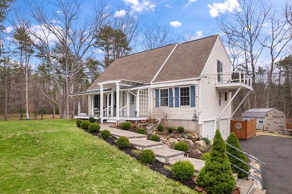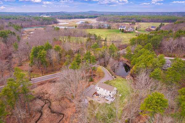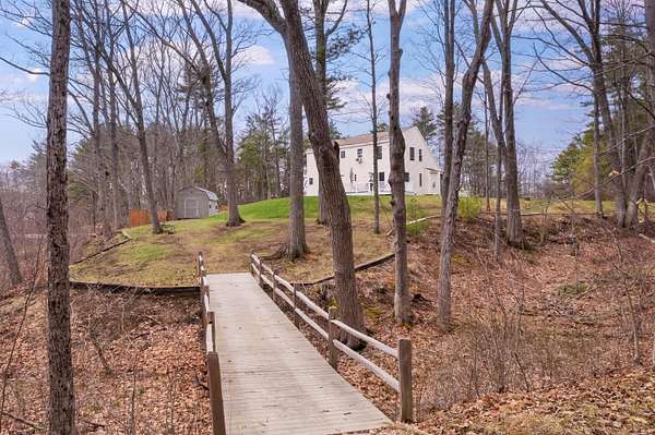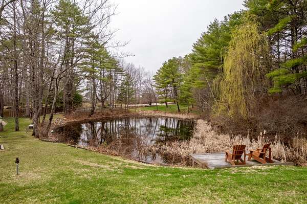 Set on a storybook 3.47-acre parcel, this bright, airy contemporary Cape offers a rare blend of privacy, comfort, and everyday livability. The setting is truly special, with lush, park-like grounds, thoughtful landscaping, open lawn, stone features, a custom wooded bridge leading to trails, and a picturesque private pond complete with a wharf, perfect for relaxing and taking in the view. Whether it's quiet mornings with coffee, casting a line on a summer afternoon, or skating across the frozen pond in winter, the property delivers year-round enjoyment.Inside, a clean, open-concept layout is filled with natural light and anchored by warm bamboo flooring throughout. The main living area flows effortlessly, with a welcoming living room centered around a gas fireplace that adds both charm and function. The adjoining eat-in kitchen is designed for gathering, featuring a butcher block island with additional storage, ample workspace, and a layout that keeps everything connected. Sliding doors extend the living space outdoors, creating an easy transition to a private patio ideal for entertaining. A hot tub enhances the setting, offering a space that feels tucked away yet accessible. The first-floor primary suite provides convenience and comfort, while upstairs offers two additional bedrooms, one with a private balcony and the other with a bonus room well-suited for a dressing area or home office.The partially finished lower level adds versatility, currently configured as a media room with a full bath and kitchenette. With its own private entrance, it's well suited for guests, extended stays, or in-law potential. Additional highlights include a new Bosch furnace and whole house standby generator adding efficiency and peace of mind. Well located with convenient access to nearby amenities, this property combines a peaceful, retreat-like setting with practical proximity, an offering that feels both relaxed and refined.