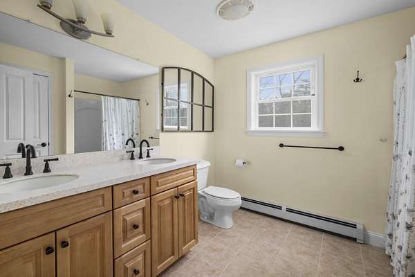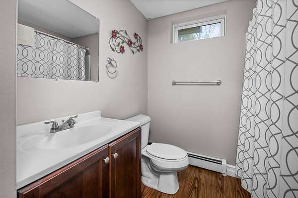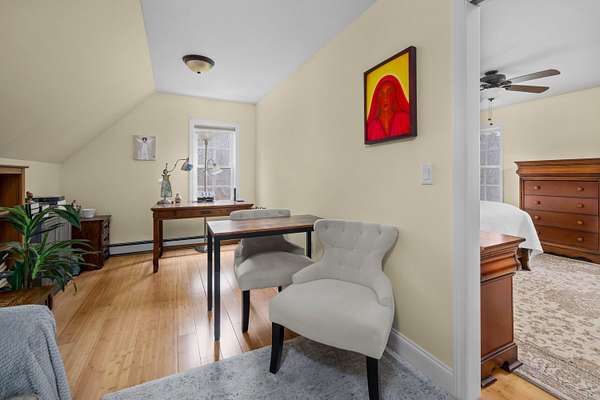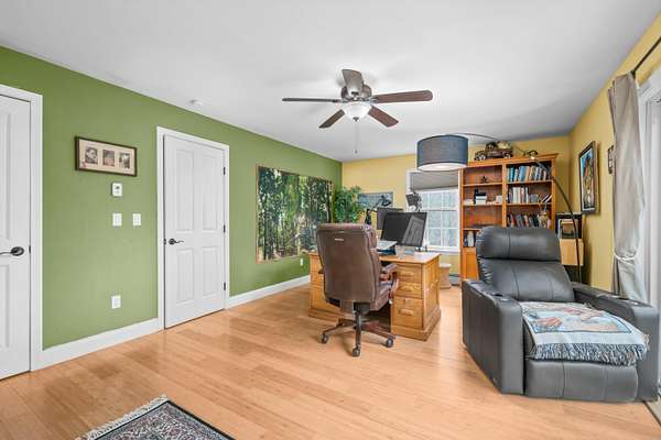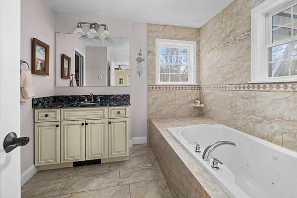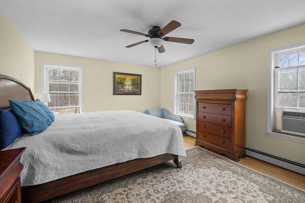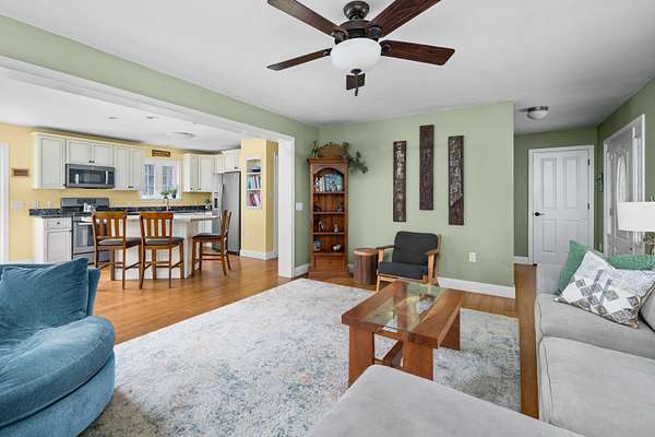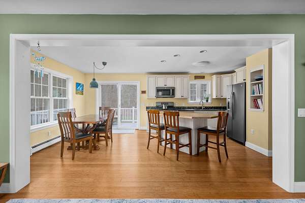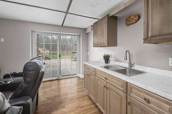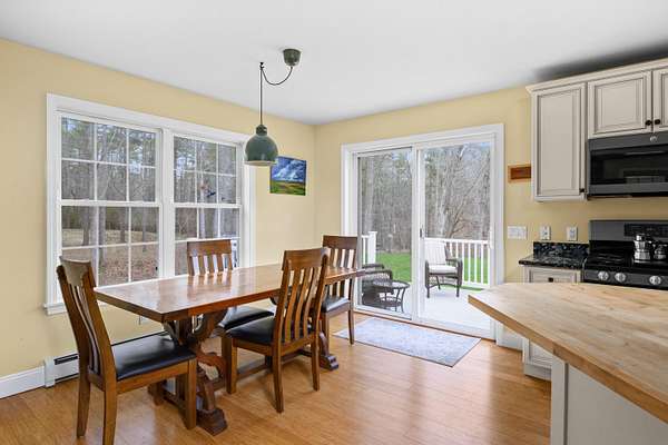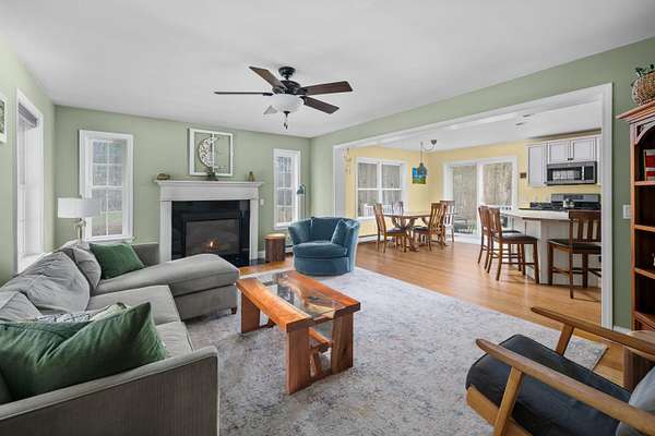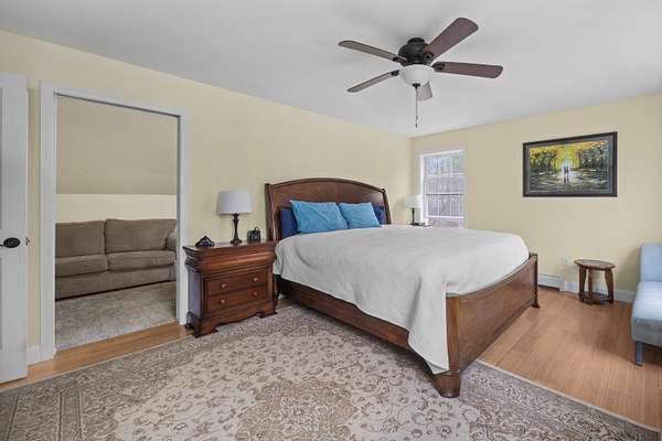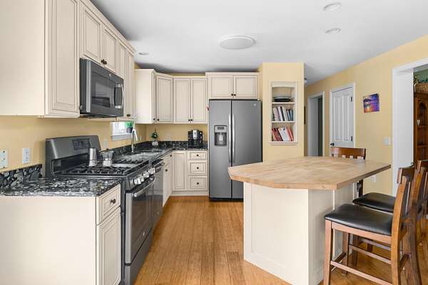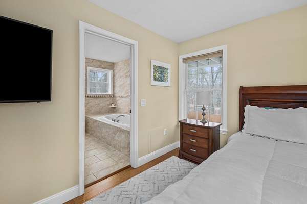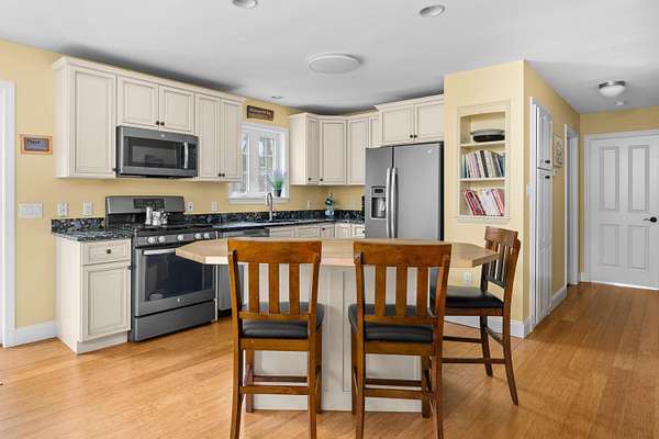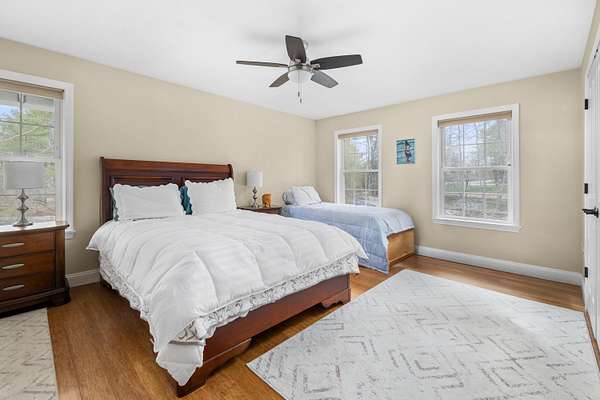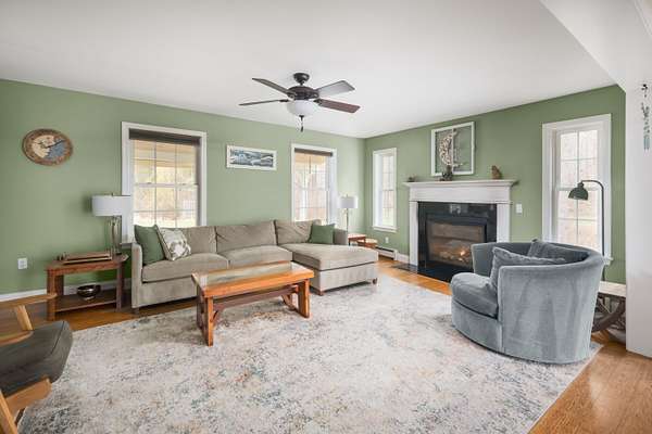 Set on a storybook 3.47-acre parcel, this bright, airy contemporary Cape offers a rare blend of privacy, comfort, and everyday livability. The setting is truly special, with lush, park-like grounds, thoughtful landscaping, open lawn, stone features, a custom wooded bridge leading to trails, and a picturesque private pond complete with a wharf, perfect for relaxing and taking in the view. Whether it's quiet mornings with coffee, casting a line on a summer afternoon, or skating across the frozen pond in winter, the property delivers year-round enjoyment.Inside, a clean, open-concept layout is filled with natural light and anchored by warm bamboo flooring throughout. The main living area flows effortlessly, with a welcoming living room centered around a gas fireplace that adds both charm and function. The adjoining eat-in kitchen is designed for gathering, featuring a butcher block island with additional storage, ample workspace, and a layout that keeps everything connected. Sliding doors extend the living space outdoors, creating an easy transition to a private patio ideal for entertaining. A hot tub enhances the setting, offering a space that feels tucked away yet accessible. The first-floor primary suite provides convenience and comfort, while upstairs offers two additional bedrooms, one with a private balcony and the other with a bonus room well-suited for a dressing area or home office.The partially finished lower level adds versatility, currently configured as a media room with a full bath and kitchenette. With its own private entrance, it's well suited for guests, extended stays, or in-law potential. Additional highlights include a new Bosch furnace and whole house standby generator adding efficiency and peace of mind. Well located with convenient access to nearby amenities, this property combines a peaceful, retreat-like setting with practical proximity, an offering that feels both relaxed and refined.