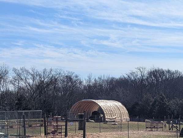 Hay Storage: A vinyl-covered Farm Tek hay barn provides protected, dry storage for feed.