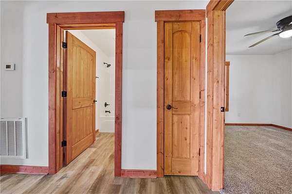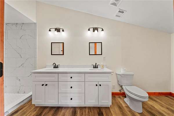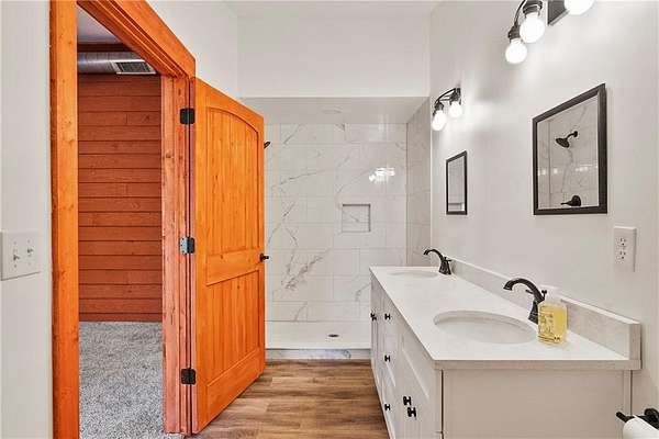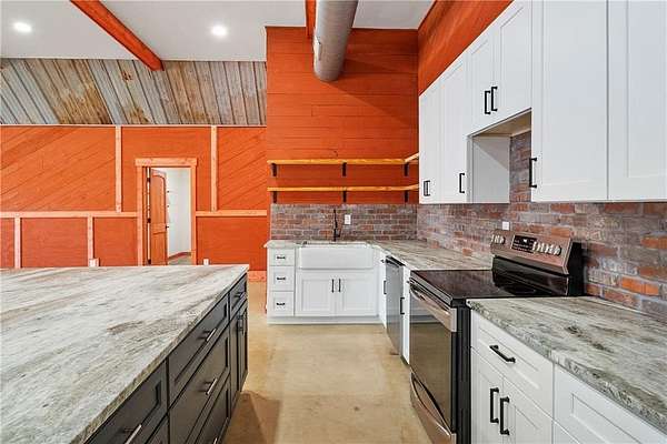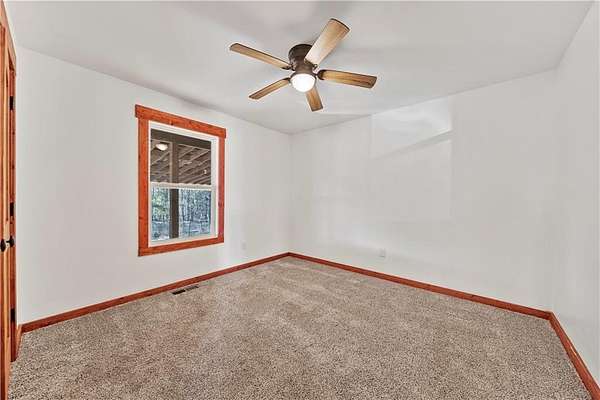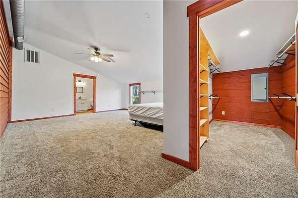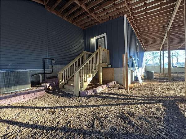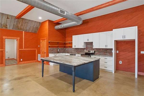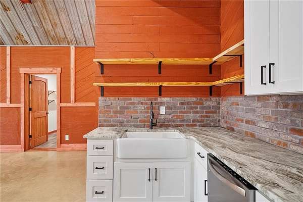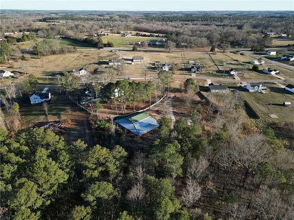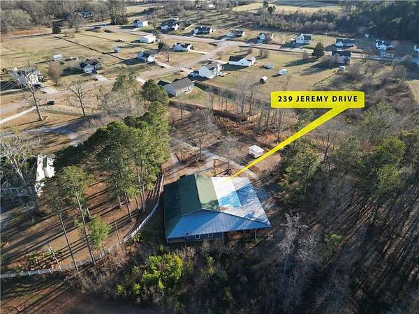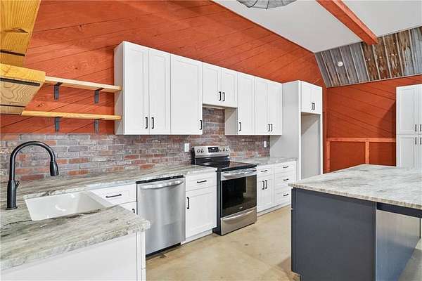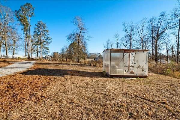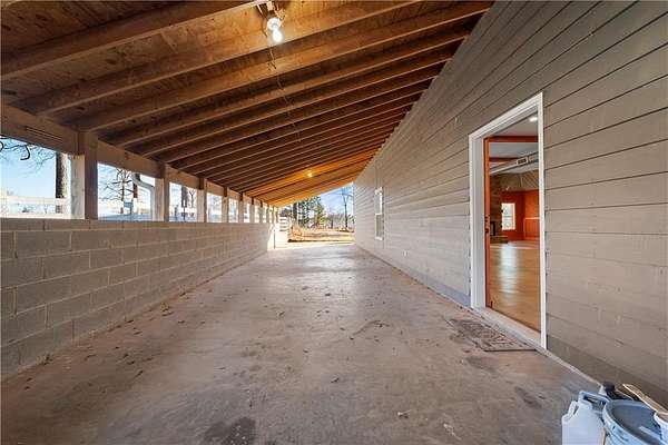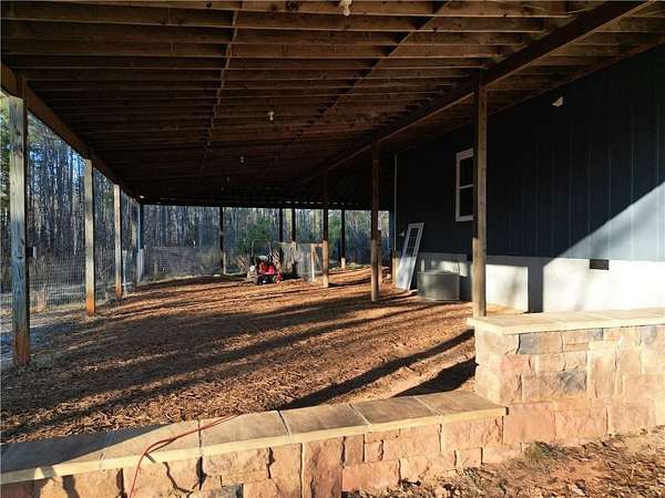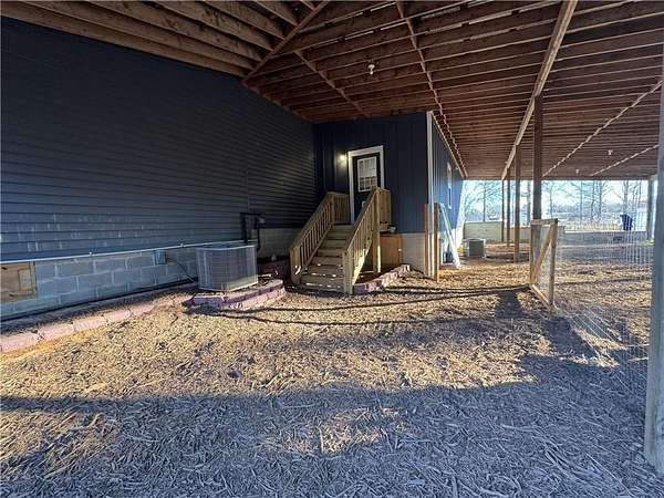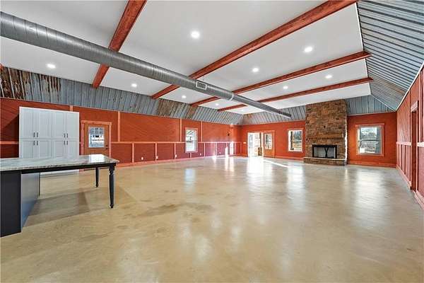 Welcome to this stunning barn style retreat blending rustic charm with modern comfort, perfectly situated on 1.81 acres with gated entry and long gravel drive. Surrounded by mature trees and natural landscape, the property has been thoughtfully cultivated as a true bird sanctuary designed to attract and maintain a thriving daily bird population. Designed with character and functionality in mind, this one of a kind property features soaring vaulted ceilings, exposed wood beams, and visible spiral ductwork that create an impressive open concept living space filled with architectural detail. The expansive family room showcases polished concrete floors and a dramatic floor to ceiling stacked stone fireplace with gas logs and wood mantel serving as the heart of the home. Warm wood walls and metal ceiling accents enhance the authentic barn aesthetic while maintaining a clean contemporary feel. The kitchen offers a striking blend of rustic and modern finishes with shaker style cabinetry, solid surface countertops, farmhouse sink, brick backsplash, oversized island, and stainless appliances perfect for entertaining or everyday living. The spacious primary suite features plush carpet, rustic trim details, ceiling fan, and a large walk in closet with custom shelving. The en suite bath includes a double vanity and tiled shower with modern fixtures, while secondary bedrooms continue the warm wood accents and generous proportions. Outdoor living is just as impressive with an expansive attached covered breezeway or carport featuring exposed rafters and concrete flooring ideal for parking, workshop space, equipment storage, or covered entertaining. The property also includes additional covered space beneath the home, fenced areas, and a greenhouse that includes additional panels should replacements or future modifications ever be needed. The fencing is equipped to be electrified if desired, though it is not currently activated. Additional improvements include fiber optic internet installed underground providing modern connectivity while preserving the natural surroundings. With its barn inspired architecture, metal rooflines, natural wood elements, dedicated bird habitat, and peaceful setting, this property offers a rare blend of rustic design and practical country living.