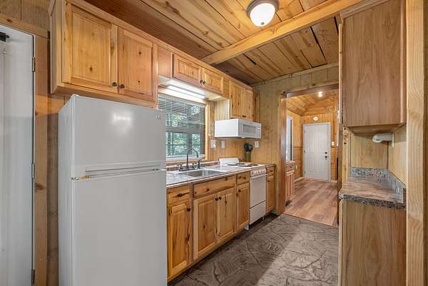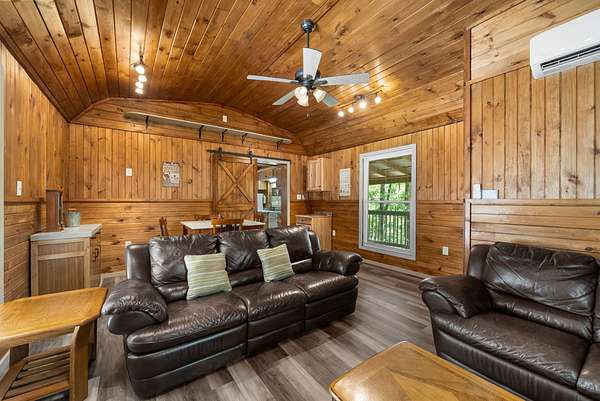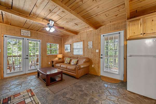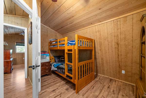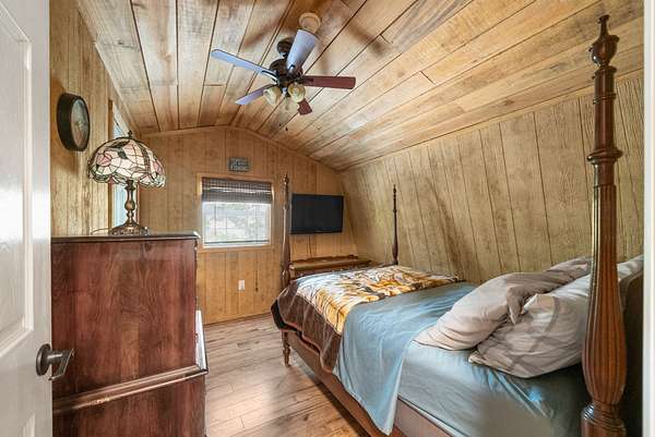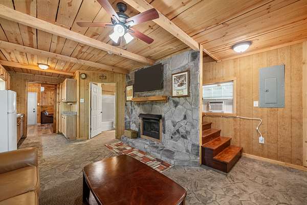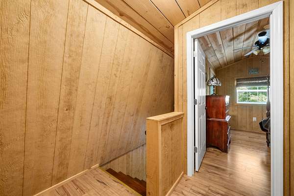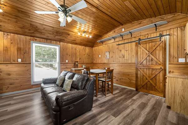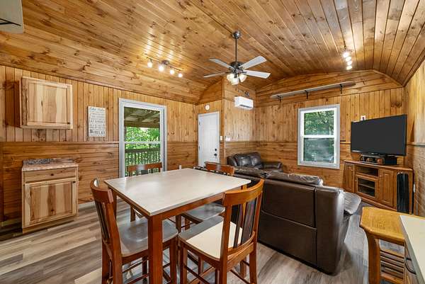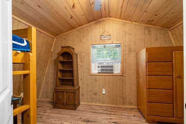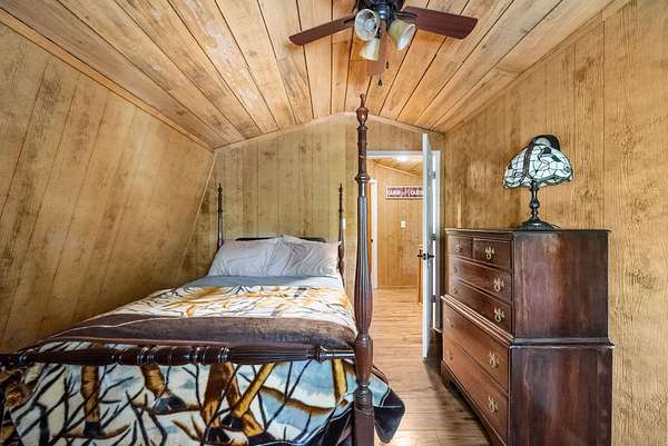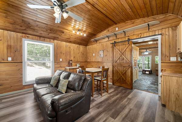 This is a meticulously cared for two-story cabin featuring one bedroom and one bathroom, perfectly nestled on a scenic ridge surrounded by beautiful trees, with a tranquil meadow stretching below for stunning views and serene privacy. Adding to its appeal, the property backs onto 400 acres of State Forest, providing remarkable opportunities for outdoor recreation and exploration or for wildlife observation or hunting.The cabin offers two spacious living areas, a well-equipped kitchen, and a whole-house water filtration system--drawing from clean, reliable well water. Enjoy comfort and productivity with high-speed internet, an additional versatile room ideal for bunk beds or a dedicated office space, and a classic stone fireplace that sets a cozy ambiance.