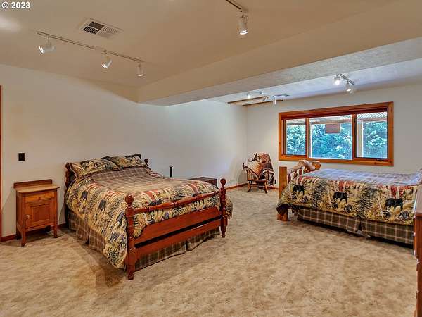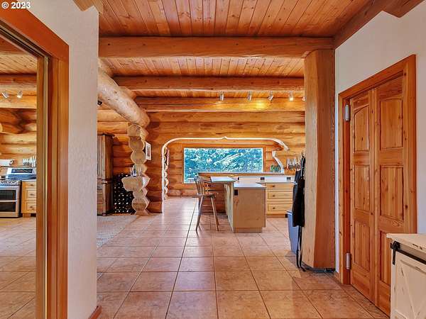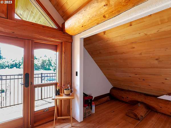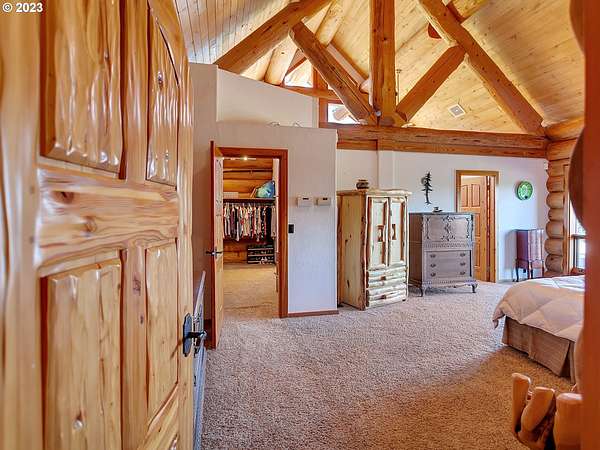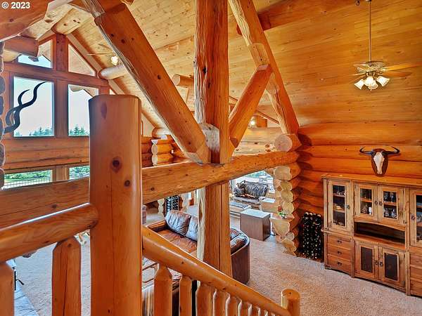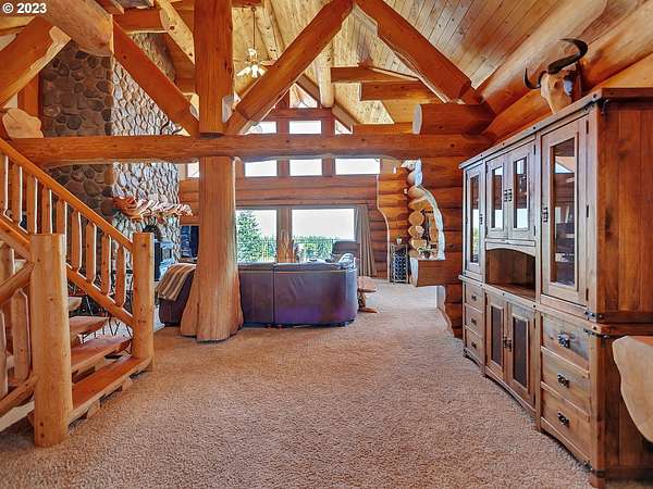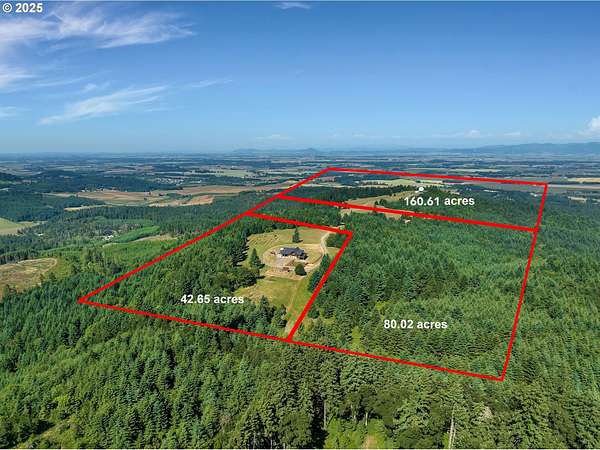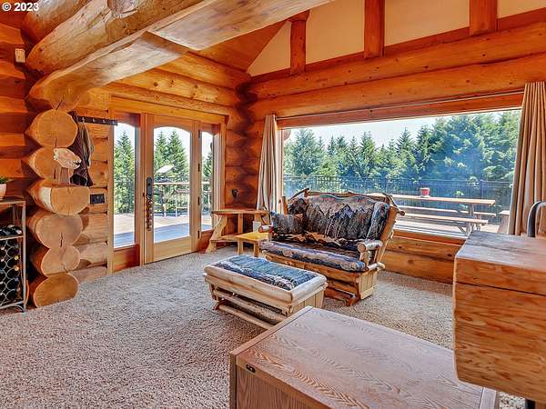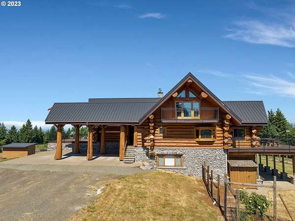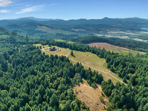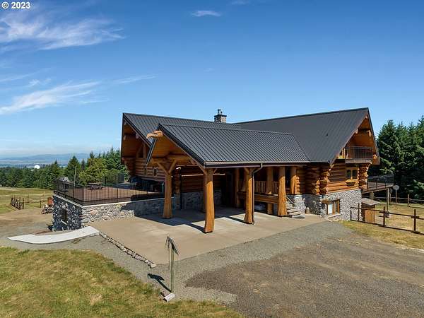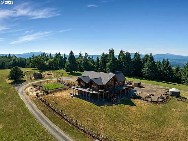 Experience breathtaking, panoramic views from this secluded custom Pioneer Log Home, gracefully perched above the Willamette Valley. Encompassing over 122 acres of rolling pasture and mature forest, this remarkable estate offers a rare blend of privacy, natural beauty, and tranquility-yet remains conveniently located just 21 miles from Eugene Airport and downtown Corvallis. Designed to embrace its stunning surroundings, the home features an expansive 2,400 sq. ft. wraparound deck-perfect for entertaining, relaxing in the hot tub, or simply taking in the sweeping valley vistas and abundant wildlife. Inside, the main level showcases a luxurious primary suite with soaring vaulted ceilings, a spacious walk-in closet, and a spa-inspired ensuite complete with an enclosed steam shower and jacuzzi tub. The thoughtfully designed layout also includes a full guest bathroom, walk-in pantry, dedicated office space, inviting dining area, and a well-appointed kitchen ideal for both everyday living and hosting. The lower level offers two generously sized bedrooms, a full bathroom, a comfortable additional living area, and a second pantry with ample storage. Upstairs, a private bedroom with a half bath provides a versatile retreat-perfect for guests, a home office, or creative studio. The land itself is equally impressive, featuring a charming orchard, yurt garden, and two separate parcels: a 42-acre homesite and an adjacent 80-acre tract. Both parcels offer marketable timber, with the larger tract also home to a pristine artisan spring.This one-of-a-kind estate seamlessly combines exceptional craftsmanship, stunning natural surroundings, and peaceful seclusion-an extraordinary opportunity that must be experienced in person to be fully appreciated.