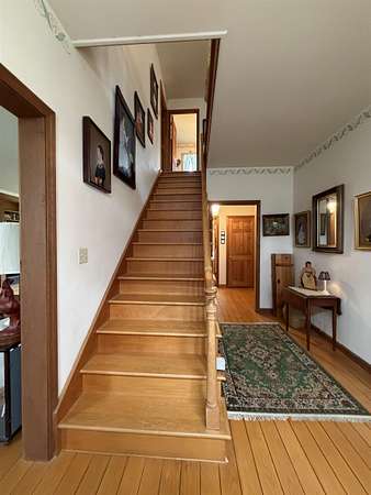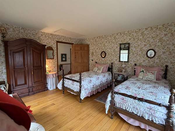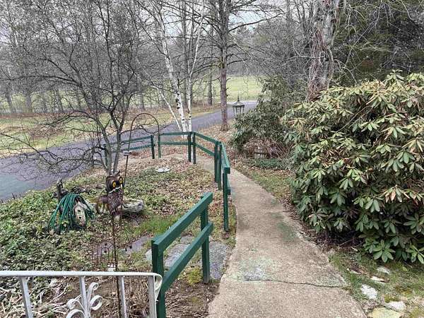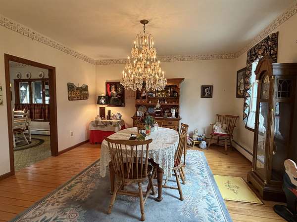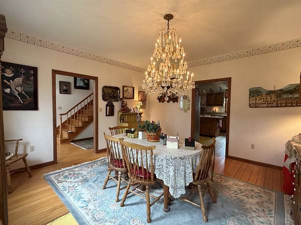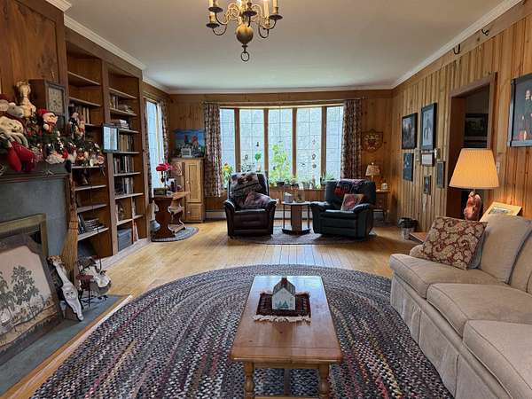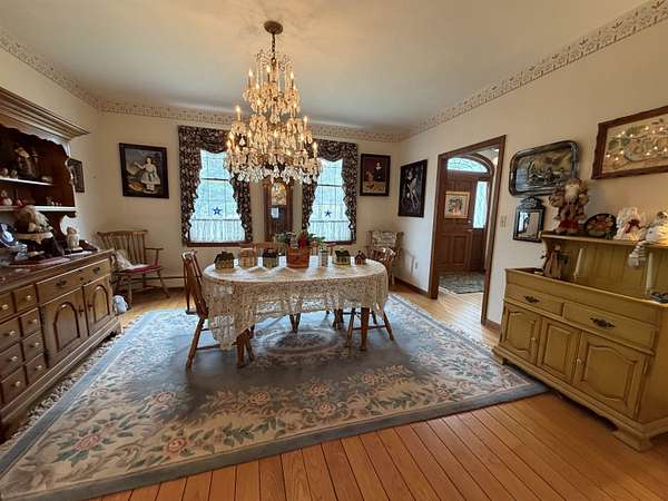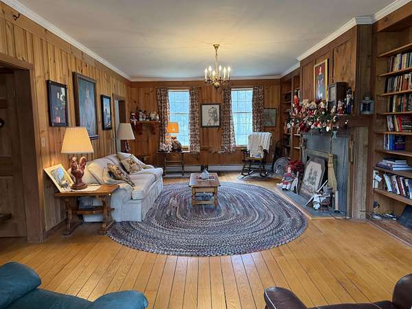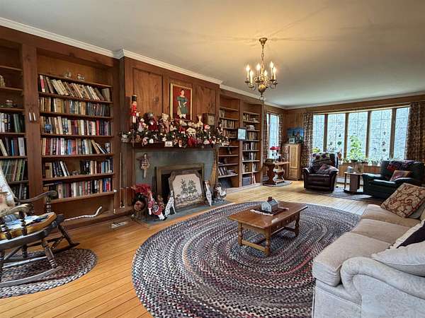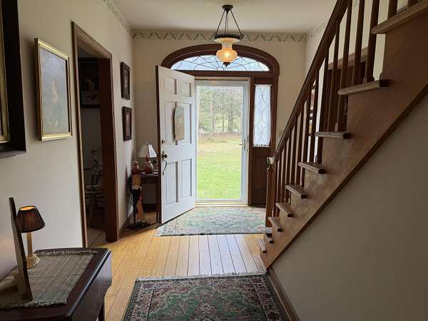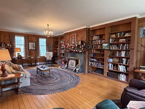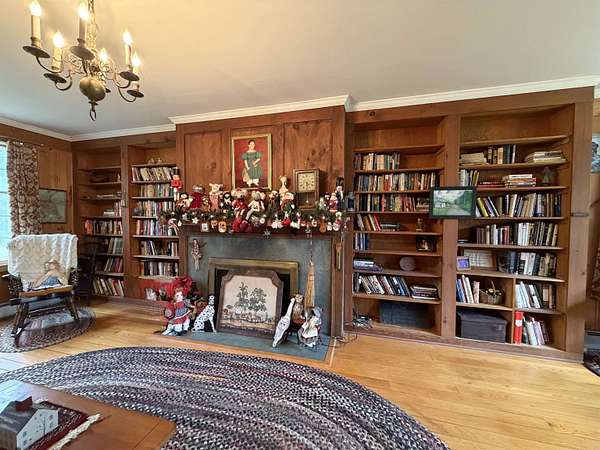 Privately set on 3.9 level acres, this country estate offers space, character, and a beautiful natural setting, with tall pines and trees screening the home from the road and a year round stream below the back lawn. Inside, a spacious foyer opens to a sun filled art studio that could easily serve as a home office. The kitchen feels cozy and inviting, with a true eat in layout, beautiful granite countertops, abundant cabinetry, ample workspace, plus a mini-split for added heat and A/C. A formal dining room with an heirloom quality chandelier adds elegance, while antique Southern Colonial style lighting brings charm throughout the home. The living room is a true showpiece, featuring a slate trimmed fireplace, extensive built-in bookshelves, and a bay window that fills the room with natural light. Upstairs, the center hall staircase leads to an oversized landing, a spacious primary suite with en suite bath and walk-in closet, and two additional bright, generously sized bedrooms. The home includes three bathrooms, one of which also incorporates the washer and dryer for added convenience. Oak hardwood floors, in great condition, run throughout both levels. Downstairs, the solid basement provides excellent workshop space and storage. A two car garage, oversized paved driveway, and well built storage shed add even more practicality, while the ornate front door with fanlight, sidelights, and slate covered steps creates a memorable welcome.