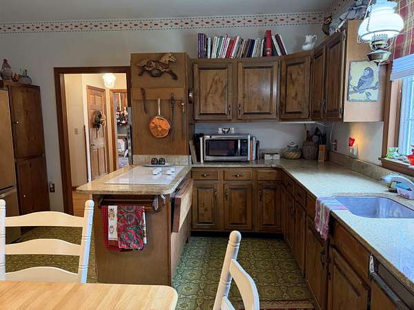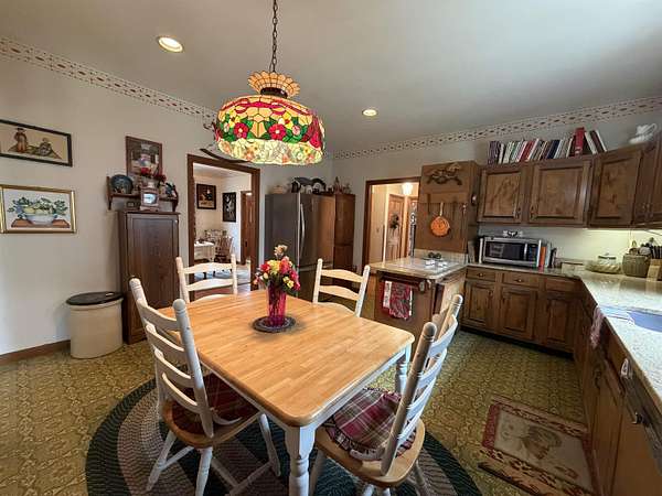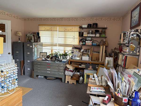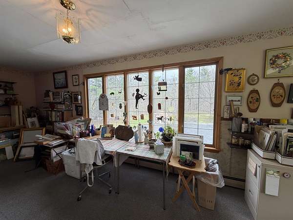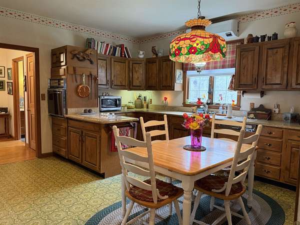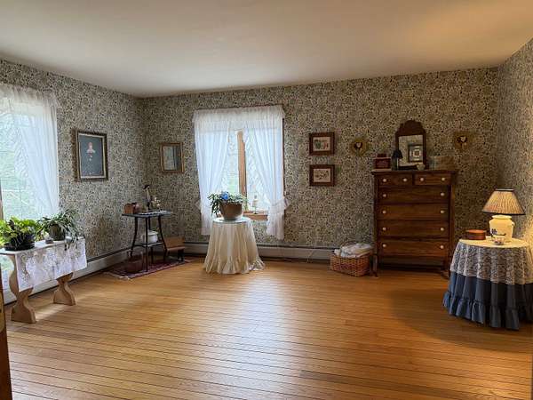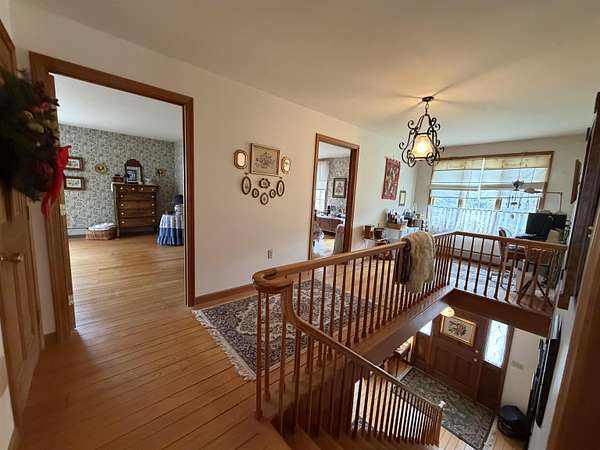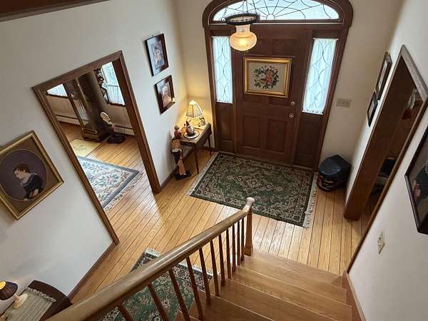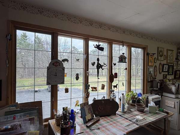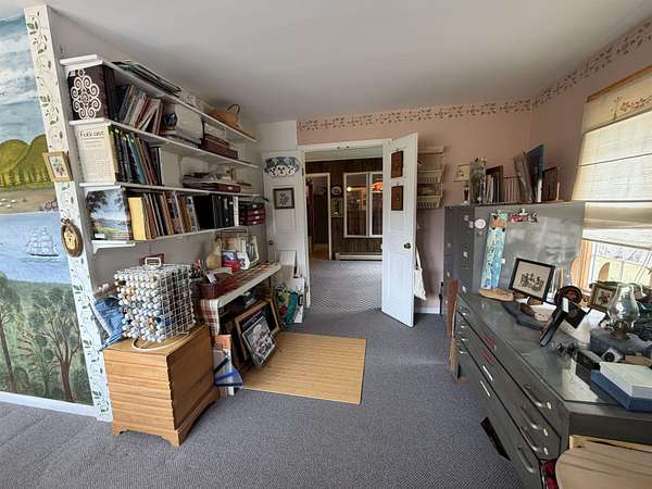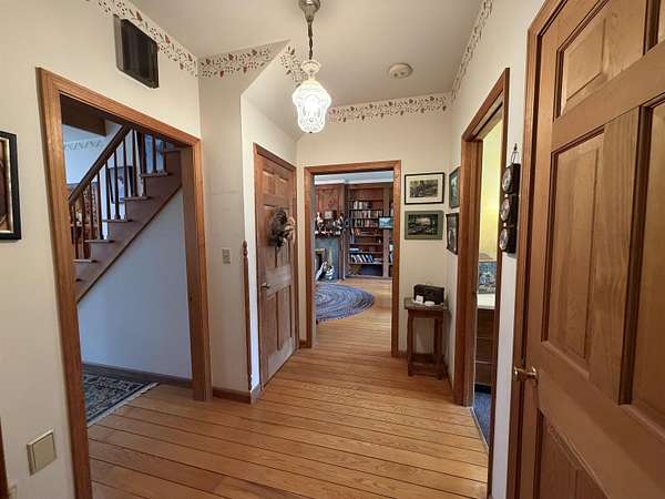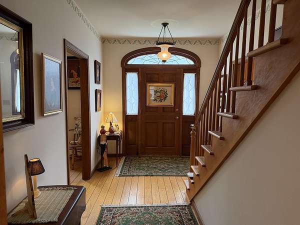Privately set on 3.9 level acres, this country estate offers space, character, and a beautiful natural setting, with tall pines and trees screening the home from the road and a year round stream below the back lawn. Inside, a spacious foyer opens to a sun filled art studio that could easily serve as a home office. The kitchen feels cozy and inviting, with a true eat in layout, beautiful granite countertops, abundant cabinetry, ample workspace, plus a mini-split for added heat and A/C. A formal dining room with an heirloom quality chandelier adds elegance, while antique Southern Colonial style lighting brings charm throughout the home. The living room is a true showpiece, featuring a slate trimmed fireplace, extensive built-in bookshelves, and a bay window that fills the room with natural light. Upstairs, the center hall staircase leads to an oversized landing, a spacious primary suite with en suite bath and walk-in closet, and two additional bright, generously sized bedrooms. The home includes three bathrooms, one of which also incorporates the washer and dryer for added convenience. Oak hardwood floors, in great condition, run throughout both levels. Downstairs, the solid basement provides excellent workshop space and storage. A two car garage, oversized paved driveway, and well built storage shed add even more practicality, while the ornate front door with fanlight, sidelights, and slate covered steps creates a memorable welcome.