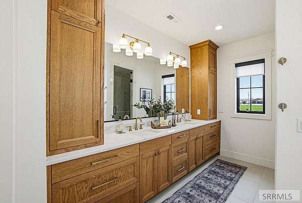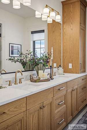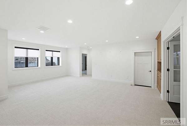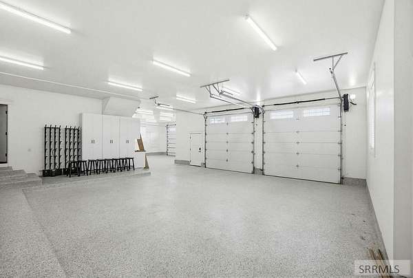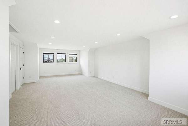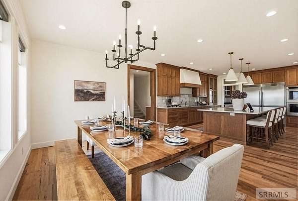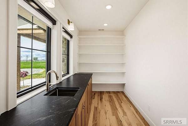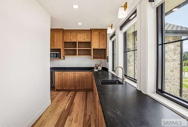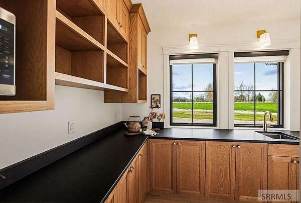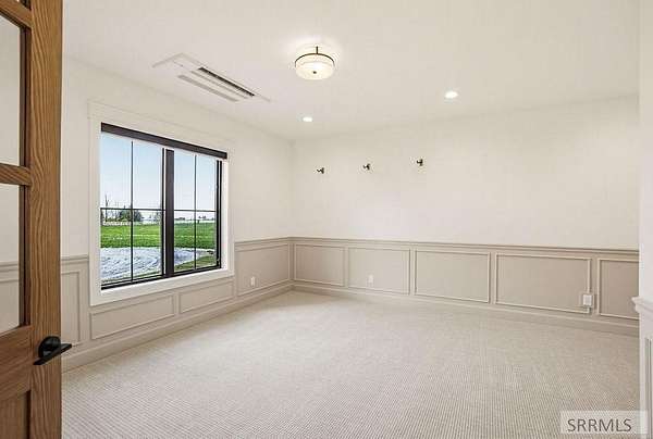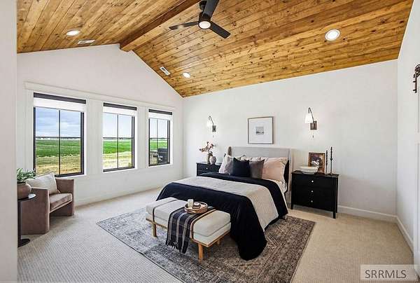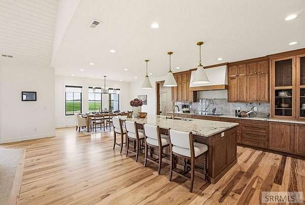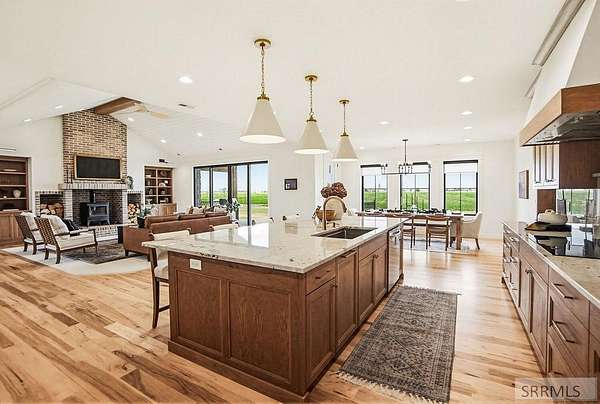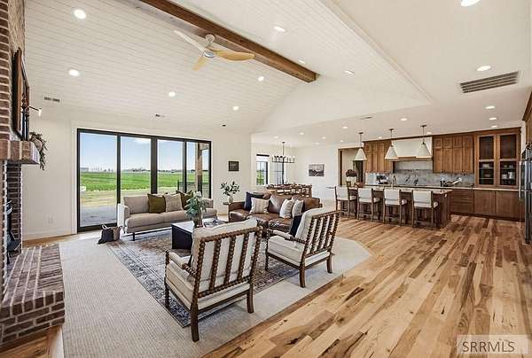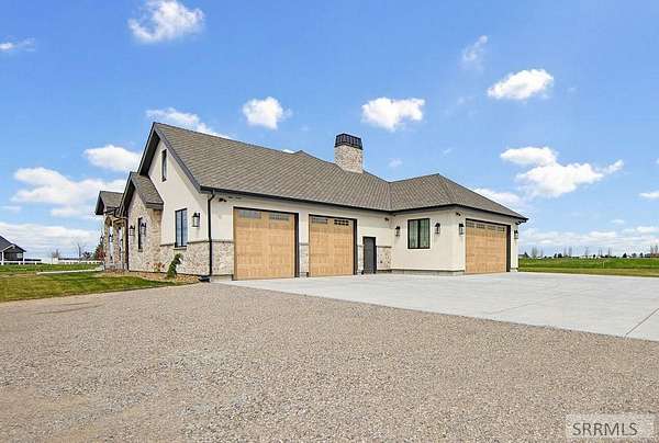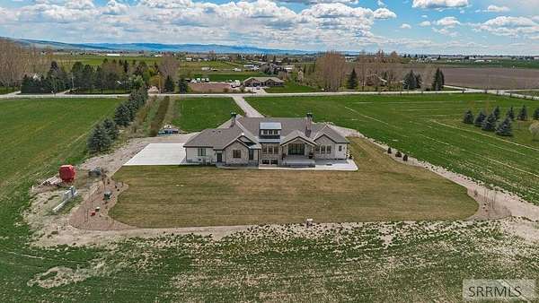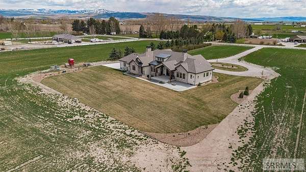New 2025 custom build by HAPCO Construction, set against eastern Idaho farmland with incredible snow-capped mountain views. At 7,428 square feet across three thoughtfully designed levels, this 5-bedroom, 5.5-bath estate blends modern craftsmanship with country quiet - hickory hardwoods, generous natural light, and an open great room that flows to a chef's kitchen anchored by double ovens and a full butler's pantry. The main level was designed for the rhythm of daily life: a private primary suite tucked away from the rest of the home, a front music and sitting room for quiet mornings, and a dedicated office. Downstairs, the home opens up for everyone else - four more bedrooms and three full baths (one en-suite), a fitness room, cold storage, a secure armory, and a massive sunken multipurpose room off the living area where movie nights, game days, and long Saturdays will host. Up in the loft, two more living spaces and a full bath give teens, guests, or a hobby a whole floor of their own. Outside, the covered back patio - vaulted tongue-and-groove ceiling, built-in heaters, sunset views - extends living outdoors year-round. Two ways to make this home yours: 10 acres + home or 21 acres + an additional building right + home