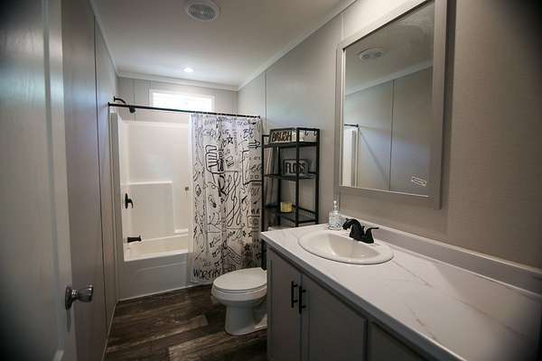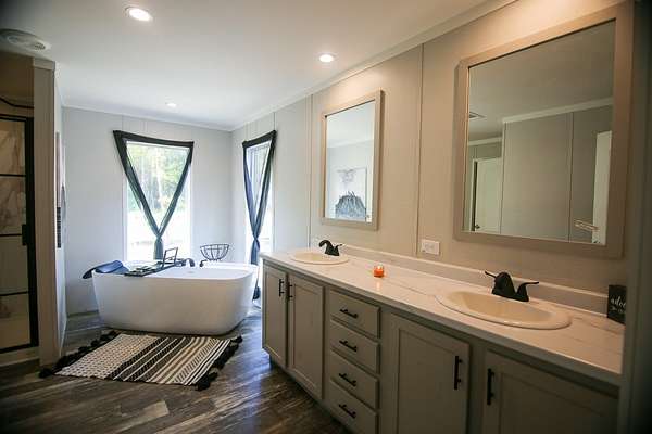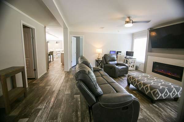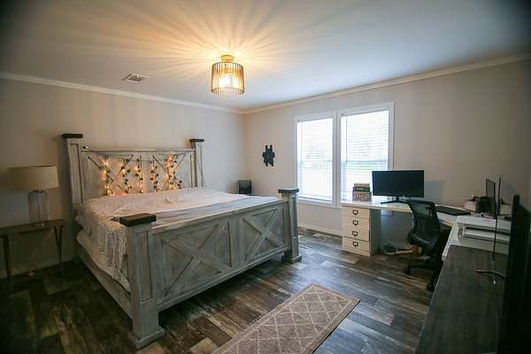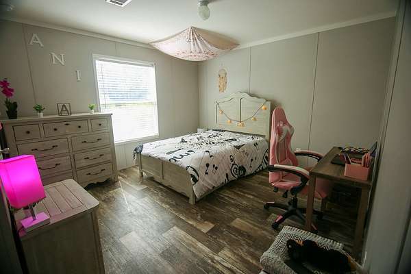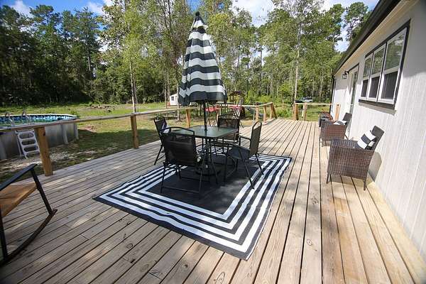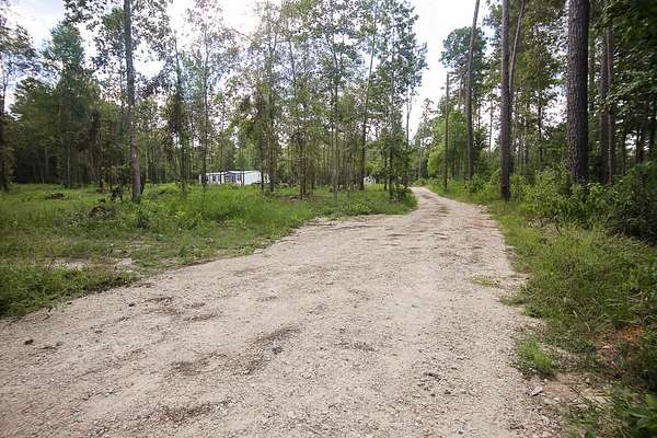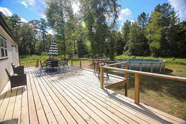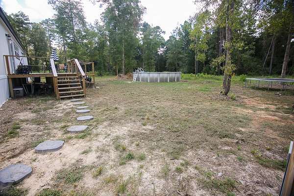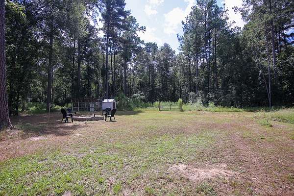 Spacious 4-bed, 2-bath manufactured home on 4.9 wooded acres. Open-concept layout features a kitchen with island seating and walk-in pantry, seamlessly connected to the dining area and main living space. A large deck off the dining area extends outdoor living. Primary suite offers a walk-in closet, dual sinks, soaking tub, and separate shower. Three secondary bedrooms (12x14 each) surround the family room with fireplace and easy access to the kitchen. Utility room includes back door access to the deck. Outdoor highlights include an above-ground pool, chicken coop, and partially cleared trails through East Texas trees. Property has underground electric to the house, community water, and aerobic system. An additional driveway with water tap and separate electric meter adds versatility. No HOA.