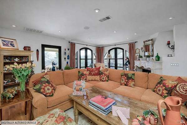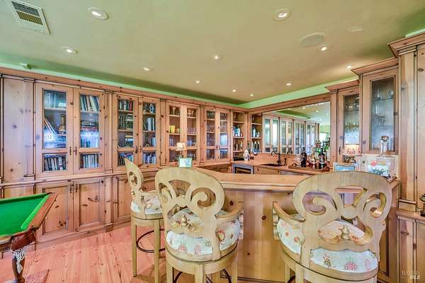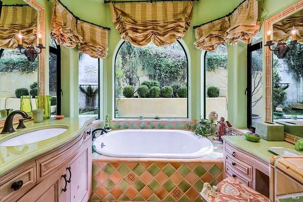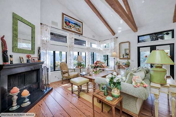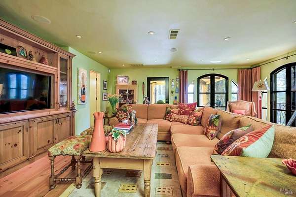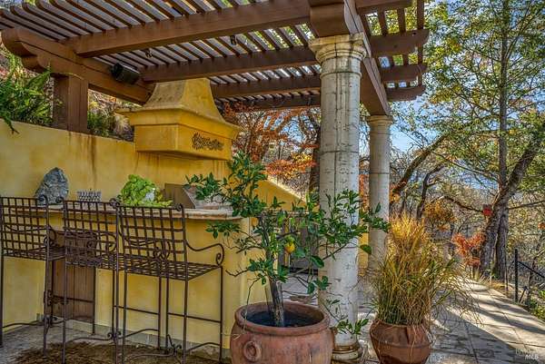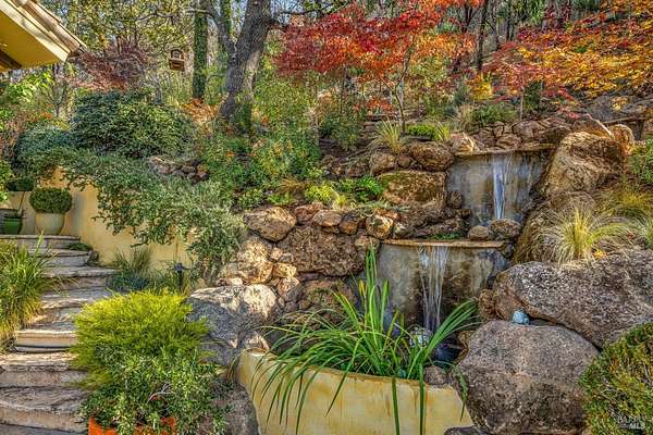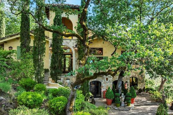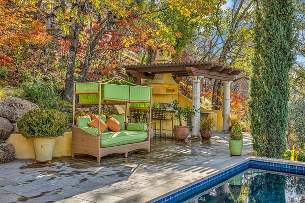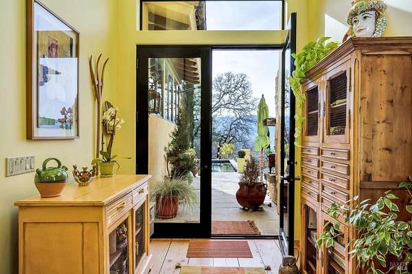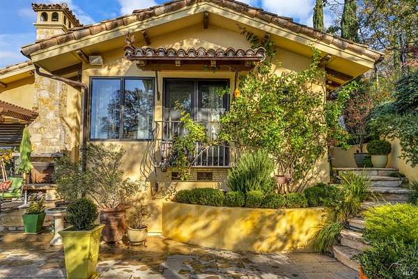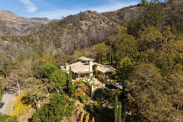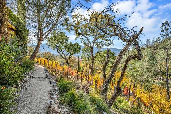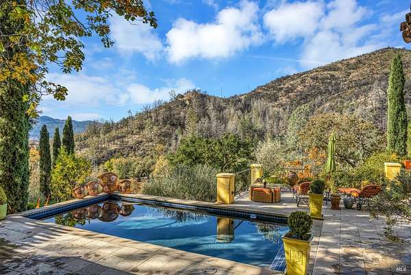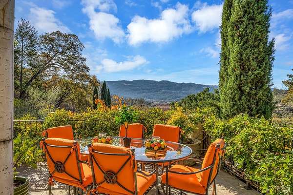 Gated estate minutes from downtown Calistoga with gorgeous views over the valley, the hills beyond, and 500 premium Cabernet vines at your doorstep. 120 Acres with a year round creek, multiple seasonal waterfalls & creeks. Italian cypress line the drive leading to the gated courtyard with Provencal fountain. The glass front door opens to golden light & soaring ceilings. The entire home shimmers with warmth & color. The kitchen, dining, and living great room has vaulted ceiling, huge open beams, art glass lights, glowing pine floors, fireplace and a wall of windows that frame the view and the sparkling pool. The home is filled with accents such as Venetian plaster walls, hand painted tilework, antique iron hardware, and artistic fixtures. The kitchen offers a huge island, Wolf range with custom hood, warming drawer, pantry and a lovely window seat to curl up with your morning coffee. The primary suite is romantic with sunset views, rose framed balconette, and French doors to a private patio with fountain. Entertaining is a delight on the back patio with swimming pool, fireplace with antique mantel, outdoor kitchen & tucked on a private terrace is a built-in sitting area by the stone spa with sunset views. Downstairs is a spacious guest suite that opens to the courtyard. The inviting family room with fireplace and full bar where you know a lot of fun will happen! It opens out to a covered patio with views of the sunset. Just in case you're feeling ambitious, theres a convenient gym. Gather guests for a picnic beneath the shade sails by the creek and listen to the frogs around the pond framed by cottonwood trees and the fruit orchard. The natural beauty combined with obvious love for the home and estate make this a very unique and special offering.