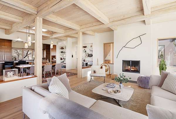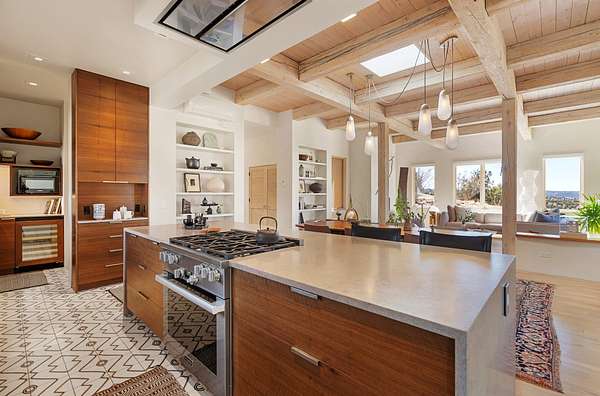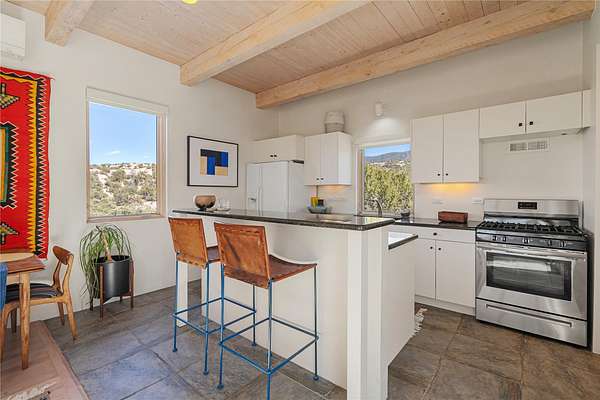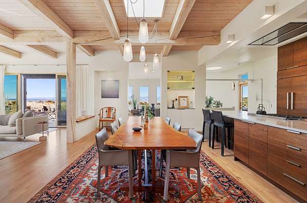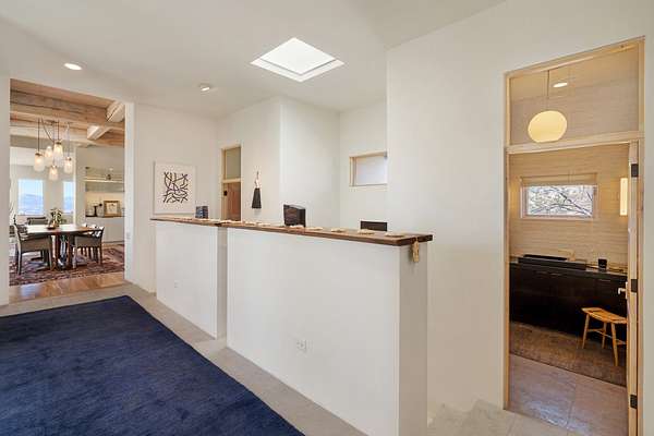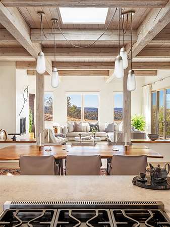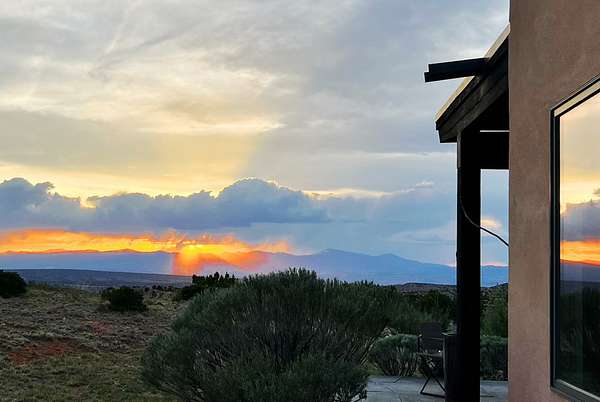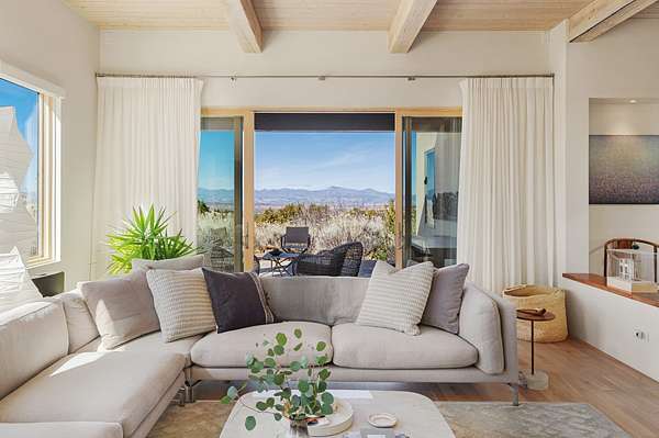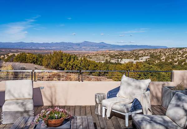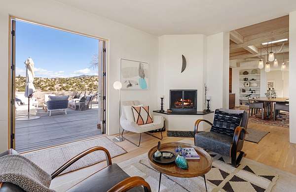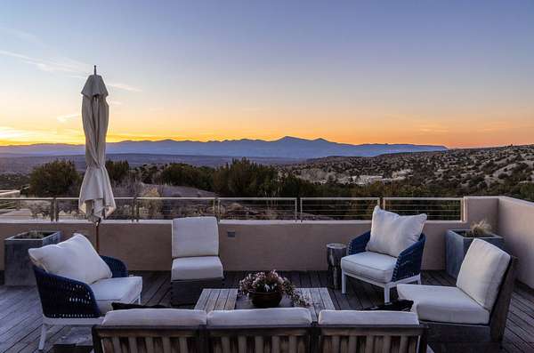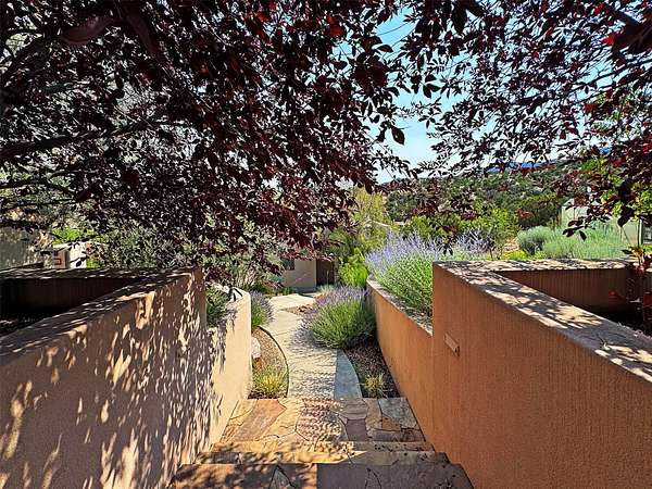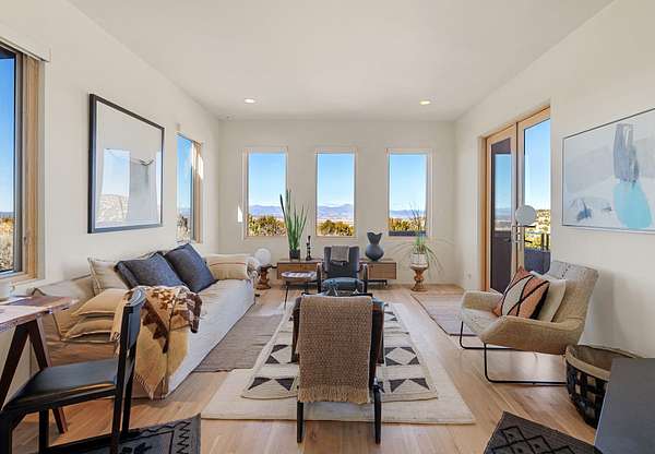 This refined main house and private casita is set high in the rolling Tesuque foothills of the Sangre de Cristo Mountains. Extensively re-designed and guided by Feng Shui principles so that energy moves smoothly, the main house creates an immediate sense of calm and well-being, with cherry wood floors, rich surfaces and fine details. A quiet retreat with serene spaces sets you inside the landscape of atmospheric views that stay with you. Three patios offer a choice of light and space throughout the day. Effortless indoor-outdoor living can be enjoyed from sunrise to sunset--this home welcomes both quiet reflection and great hosting.The kitchen cabinetry and other custom pieces were milled and hand made from a single walnut tree from Oregon by a local artisan.The great room and den offer warmth and light, with curated views, and each open directly onto its own outdoor space. The calming primary bedroom flows into a restorative, spa-like experience: From soaking tub to sauna to shower, then stepping outdoors to the hot tub for star gazingan outdoor shower completes the experience. Next, the charming 2-bedroom, 2-bath guest house, which is separated by gorgeous native plantings and fruit trees, has its own entrance and parking to provide exceptional privacy and flexibility for guests. This home offers a rare balance of seclusion and access-equally suited as a lock-and-leave retreat or a primary residence. Serene and immersed in nature, yet minutes from The Four Seasons, Tesuque Village Market, El Nido, and app. 15 minutes to the Plaza and the Santa Fe Opera. Gated Los Caminitos comprises 573-acres with mapped trails for residents, a clubhouse, pool, tennis and pickleball.