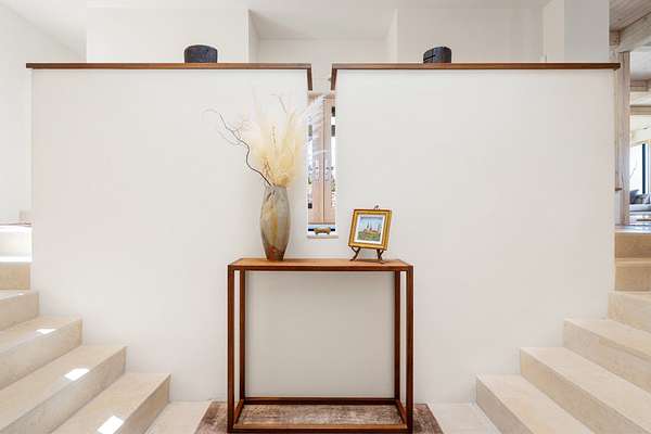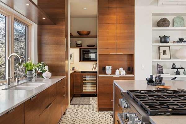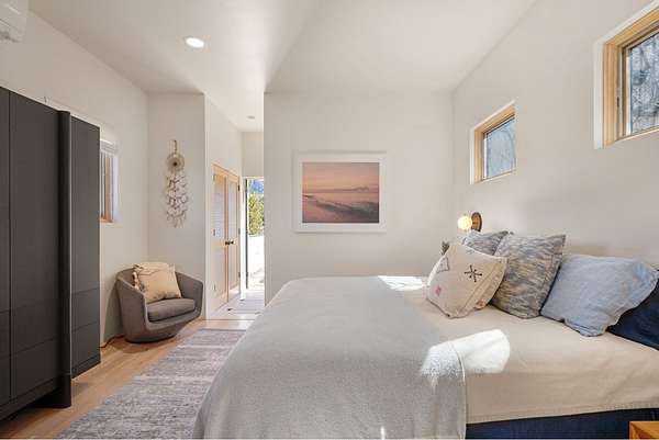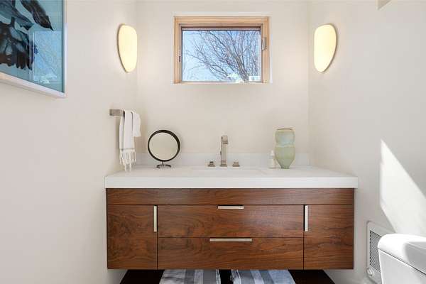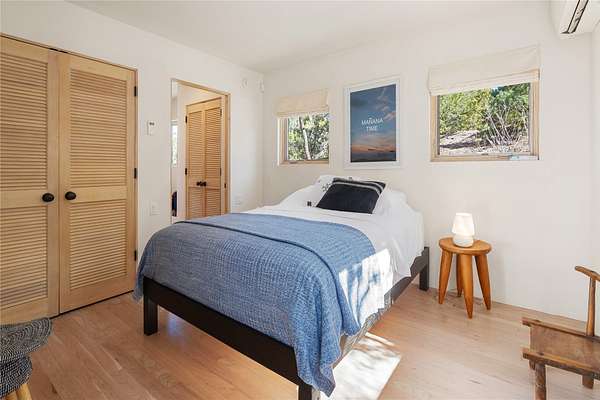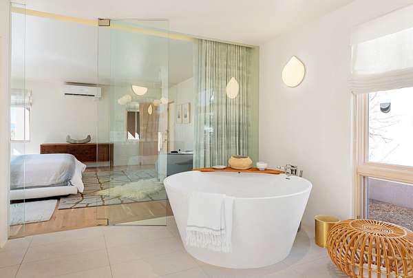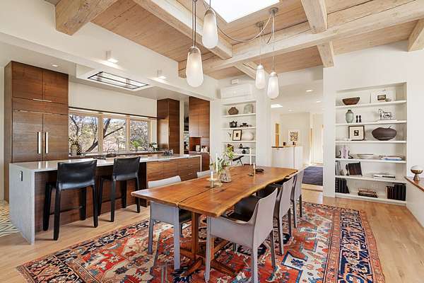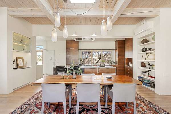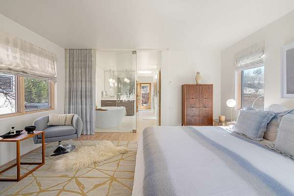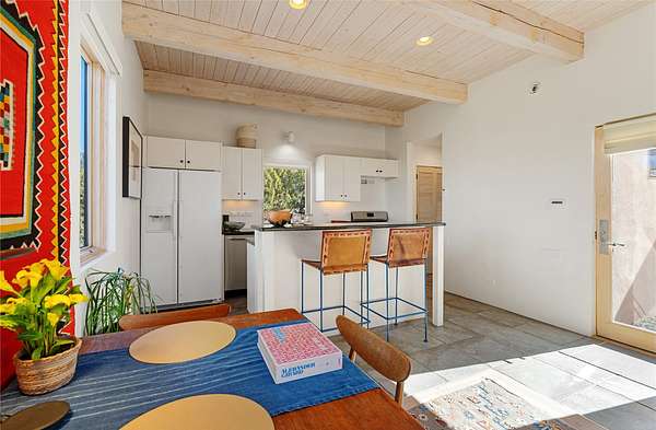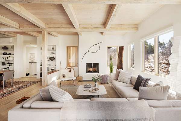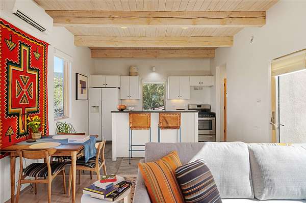 This refined main house and private casita is set high in the rolling Tesuque foothills of the Sangre de Cristo Mountains. Extensively re-designed and guided by Feng Shui principles so that energy moves smoothly, the main house creates an immediate sense of calm and well-being, with cherry wood floors, rich surfaces and fine details. A quiet retreat with serene spaces sets you inside the landscape of atmospheric views that stay with you. Three patios offer a choice of light and space throughout the day. Effortless indoor-outdoor living can be enjoyed from sunrise to sunset--this home welcomes both quiet reflection and great hosting.The kitchen cabinetry and other custom pieces were milled and hand made from a single walnut tree from Oregon by a local artisan.The great room and den offer warmth and light, with curated views, and each open directly onto its own outdoor space. The calming primary bedroom flows into a restorative, spa-like experience: From soaking tub to sauna to shower, then stepping outdoors to the hot tub for star gazingan outdoor shower completes the experience. Next, the charming 2-bedroom, 2-bath guest house, which is separated by gorgeous native plantings and fruit trees, has its own entrance and parking to provide exceptional privacy and flexibility for guests. This home offers a rare balance of seclusion and access-equally suited as a lock-and-leave retreat or a primary residence. Serene and immersed in nature, yet minutes from The Four Seasons, Tesuque Village Market, El Nido, and app. 15 minutes to the Plaza and the Santa Fe Opera. Gated Los Caminitos comprises 573-acres with mapped trails for residents, a clubhouse, pool, tennis and pickleball.